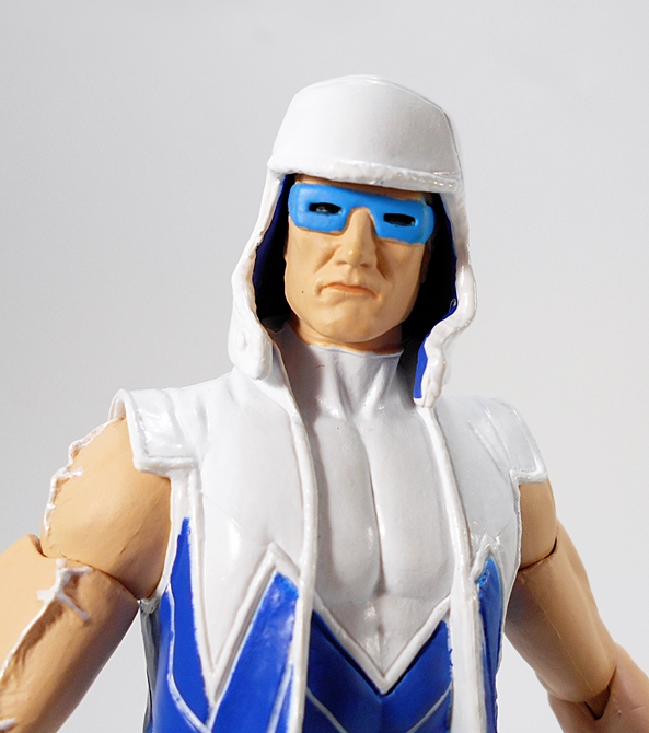 And here’s Snart out of the box. While I tend to be OK with a lot of the costume changes in the New 52 Era (Yes, I realize that’s a minority opinion to hold), I was not overly pleased with Snart’s. In fact, next to New 52’s first version of Poison Ivy, Captain Cold’s look is one of my least favorite of the whole shebang. With his weird hat-hood, his sleeveless jacket, and his Art Deco vibe, I’m just not sure what they were going for here when they designed it. That’s not to say the figure doesn’t look good. DCC did a fine job translating this look to figure form. The white paint is super clean, the shade of blue is gorgeous, and the gold belt really makes the figure pop all the more. Overall, the paint lines are pretty clean too.