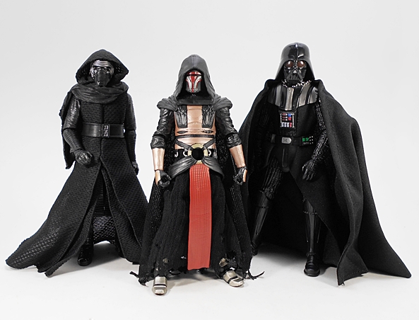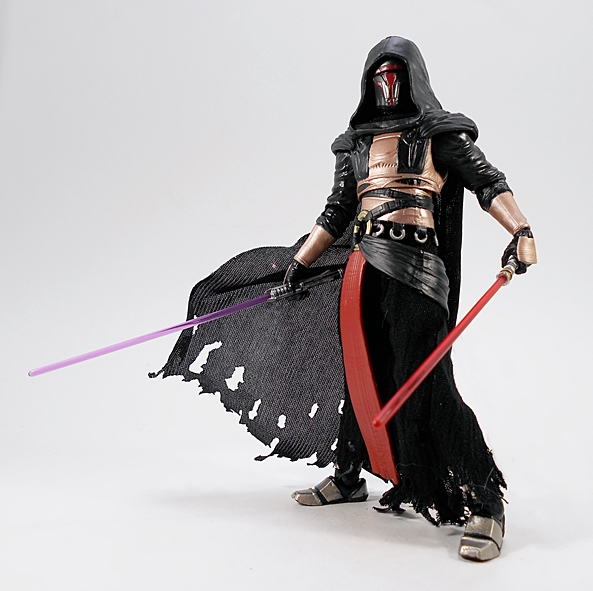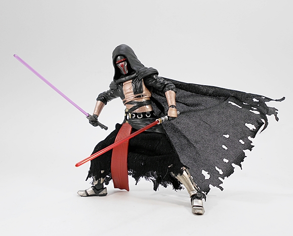 Revan’s design always felt just a little too derivative of Vader to me. Granted, the mask was necessary due to complications of his true identity, but the black cape and robes struck me as a wee bit lazy. We need a new villain, just put a mask and black robes on him. So, why do I give Kylo Ren a pass? Because imitating Vader was the whole motivation of that character. Now, with all that having been said, I still think Revan is a cool looking character and this figure does a nice job with the design. The sculpted gold pieces of his armor and that giant ring in the center of his gut contrast nicely with the use of the soft goods. And in the end, I think it’s the mix of sculpted plastic cloth and real cloth that represents this figures greatest strengths and weaknesses.