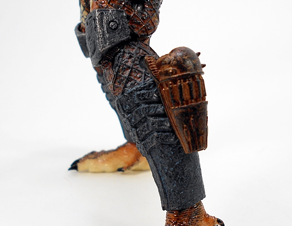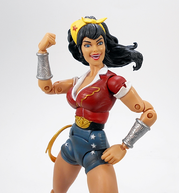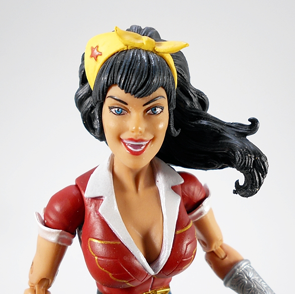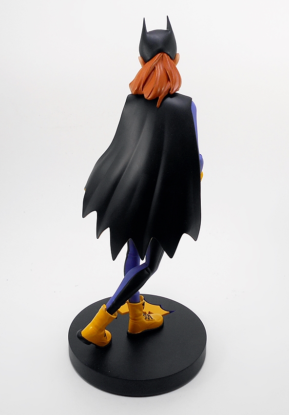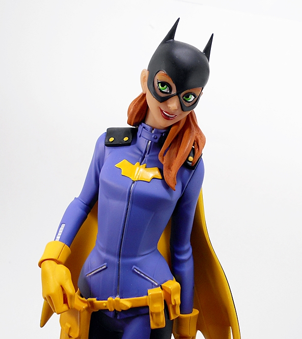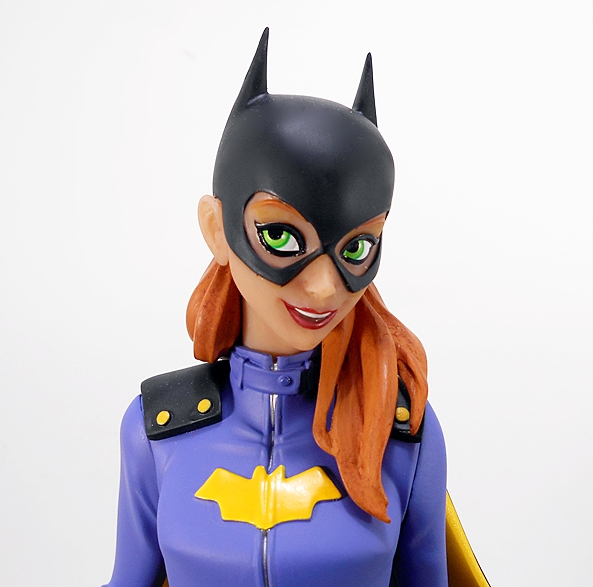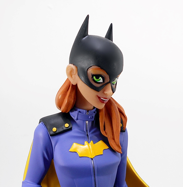 The portrait is just plain adorable. I love the way her head tilts down to the left while she glances up to the right with her big green eyes. And that smile says it all! Her cowl appears to be sculpted separately from the face, which gives the head some welcome depth, even more so than if there were just sculpted lines. The reddish-orange hair swirls around her neck and drapes down her left shoulder. There’s so much personality in this portrait, and like the pose I think it just captures Babs Tarr’s Batgirl perfectly.