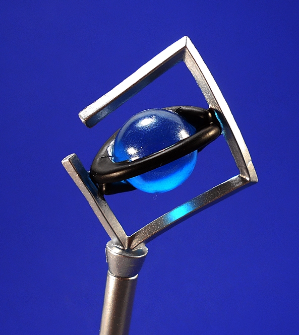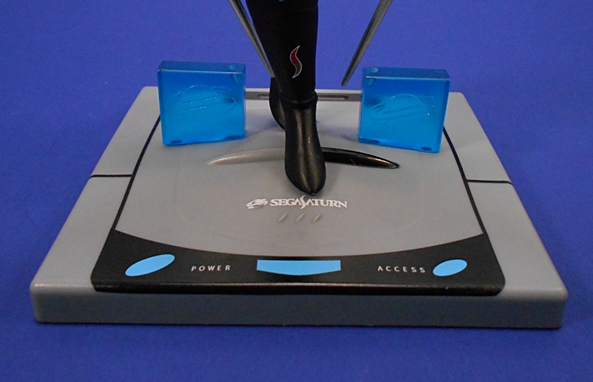 Saturn’s base is… a Saturn console! And a gray Japanese version, at that! The details, like the buttons and logo, are all painted on, and you get two translucent blue squares with the Saturn logos that peg in beside each of her feet. It was a little hard to get her pegs seated properly due to a particularly tight fit, but she eventually went in there. I don’t know that I’d risk disassembling her too many times.