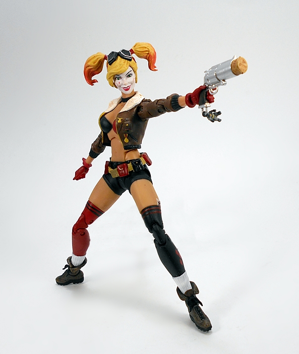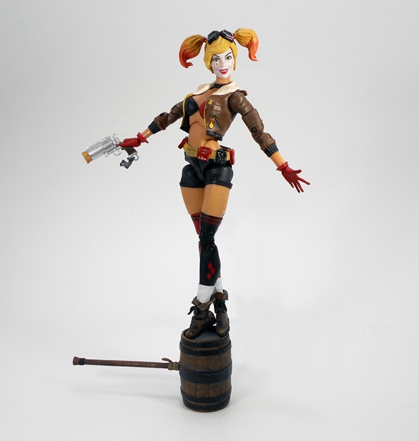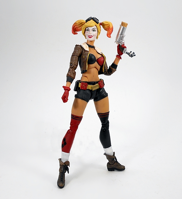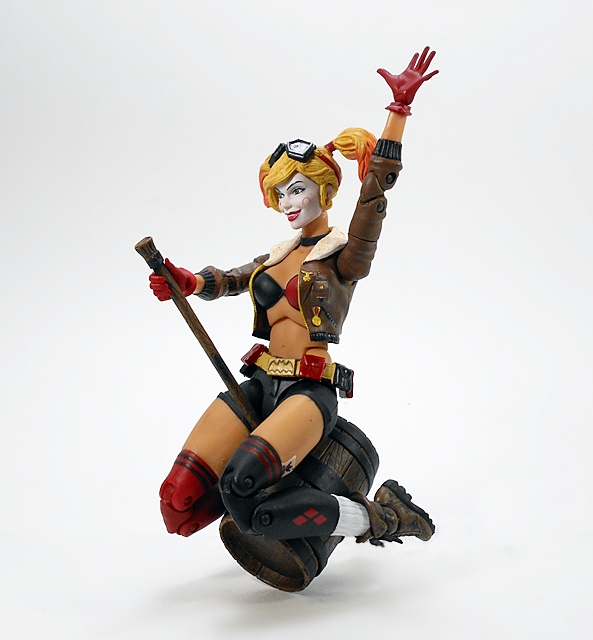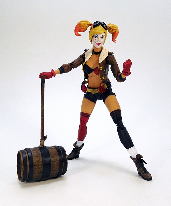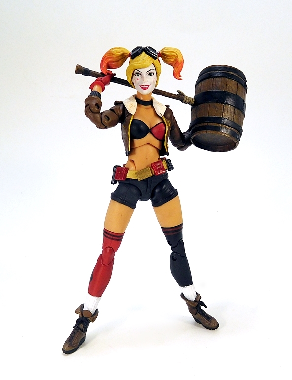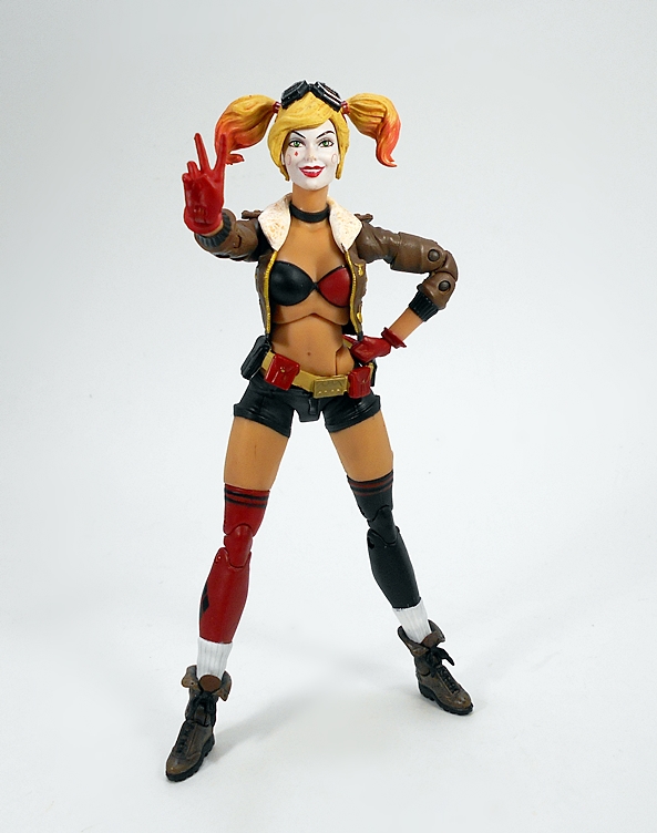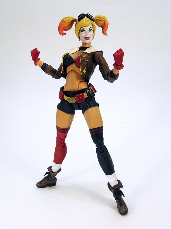 And here she is! Harley sports a cool WWII-era bomber jacket, capped off with a fur-lined collar, red aviator gloves, and a skimpy red and black top. From the waist down she has a very short pair of shorts, red and black thigh-high stockings and adorable little socks and boots. The ensemble is finished off by a simple black choker and a re-purposed Batman utility belt with the pouches customized with red and black paint. I love this costume. It captures the feel of the era, while still preserving Harley’s signature look. The paint is pretty sharp too, the plastic used for the skin tone looks great, and the finish on the jacket and the boots looks particular fantastic.