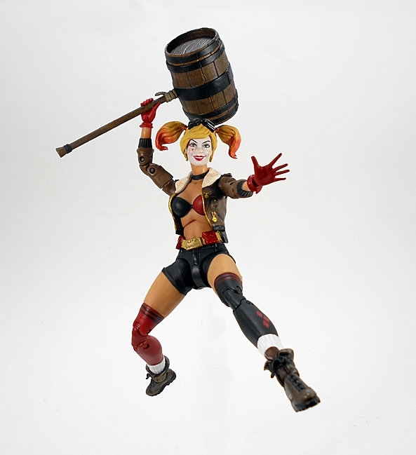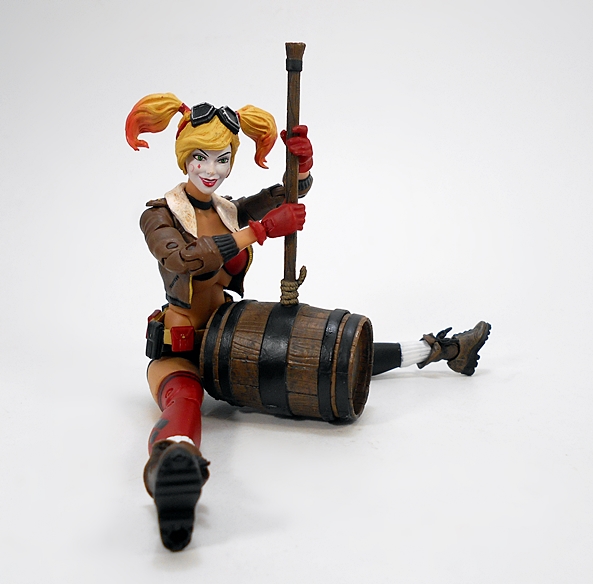 And it wouldn’t be Harley without a giant, obnoxious hammer! This one is basically a barrel with a handle on it. Once again, the quality of sculpt and paint on this piece is exceptional. The individual planks that make up the barrel are sculpted with some pretty realistic wood grain texturing. There’s even sculpted rope wrapped around the shaft where it meets the barrel. It’s a comically huge and heavy weapon, but Harley can hold it pretty well.