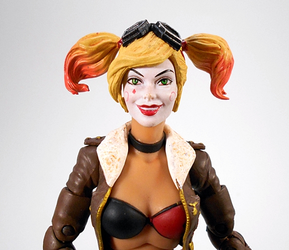 The portrait is also excellent. Harley features yellow hair with fiery tips on her pigtails and a pair of aviators goggles perched up high on her head. Her face is painted white and she’s got beautiful green eyes and bright red lips. It’s both instantly recognizable as Harley, and yet still manages to feel like a fresh and original take on the character. The circles on her cheeks and the little diamond under her eye are nice touches.