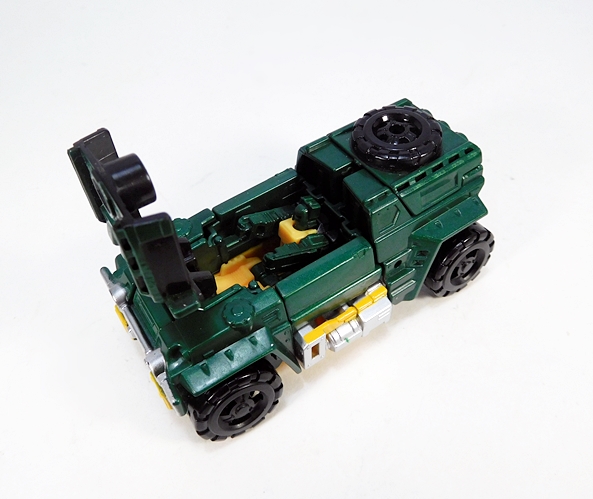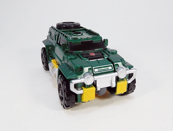 True to his original G1 form, Brawn takes the form of a green off-road vehicle, and this is a pretty solid one at that. There isn’t a whole lot of sculpted detail here, but you do get a spare tire on the rear of the roof. More importantly, the coloring on this little 4×4 is especially nice for a Legends Class. The pretty metallic green is joined by some black painted windows, and yellow bits peeking out from the sides and the front, all of which keeps his deco very faithful to the original toy. You also get some lovely silver on the front bumper and a tiny Autobot insignia on the hood. And so in the end, this vehicle may be a little modernized, but there’s no denying who this is supposed to be.
