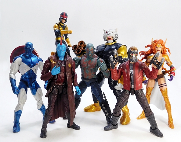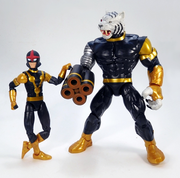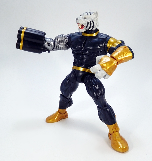 Like Vance, Titus may not have been high on a lot of people’s lists either, but unlike Vance, Titus is a pretty new character, and a short lived one at that. Or wait… didn’t he come back shortly after? Either way, none of that makes him any less welcome to me. No sir. Why? Because he’s a giant space tiger with a cyborg eye and a gun arm for Chrissakes! If you haven’t been keeping track, Titus is built with six parts scattered throughout this wave (Don’t forget, Star-Lord didn’t come with one!), making him a pretty standard BAF. As a former Special Ops of the Nova Corps, his buck features the very attractive dark blue and gold deco, but lacking the Nova symbol on his chest. He’s got a sculpted robot right arm, which looks very Colossus-y and leads into a massive four barrel instrument of death. His other arm is punctuated by a grasping tiger claw.