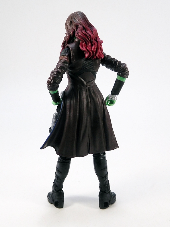 The sculpted jacket fits the figure well, cinching in at the waist and fanning out below until it reaches her knees. It’s fairly light and features a slit running up the back, so it doesn’t really impede her articulation much at all. There is some great looking texturing on it that makes it look even better than a regular comic figure. Indeed, there’s enough detail on it that it would look right at home on an MCU figure.
