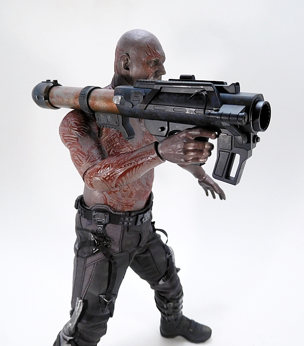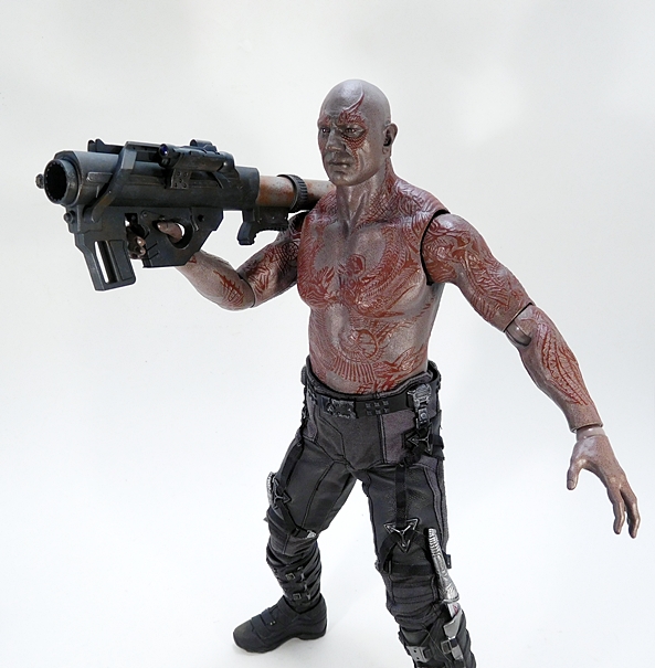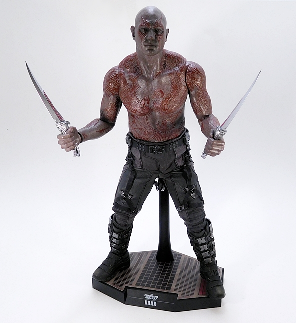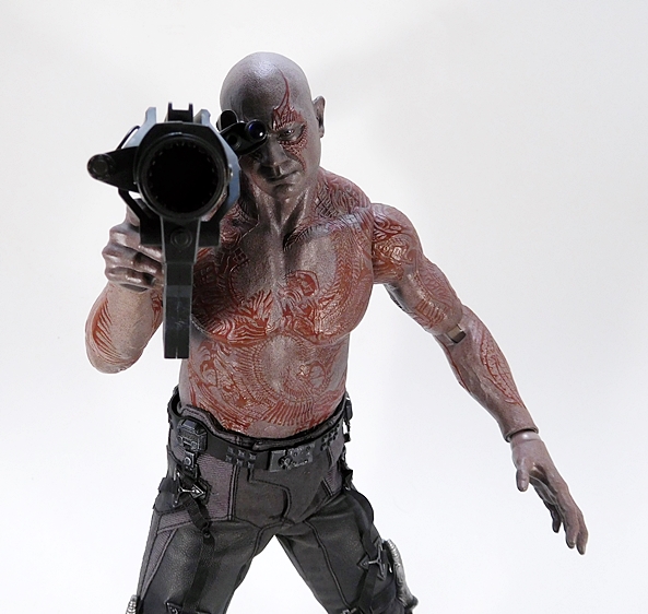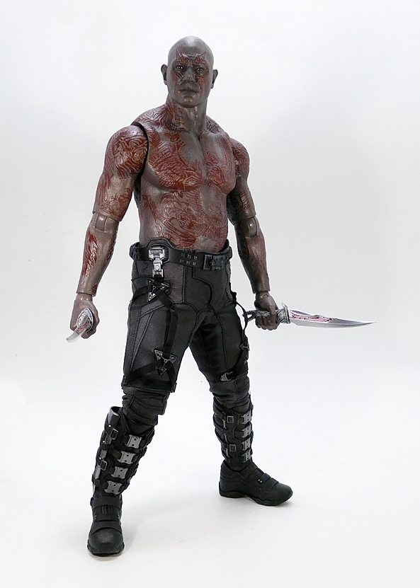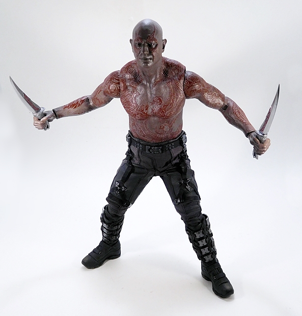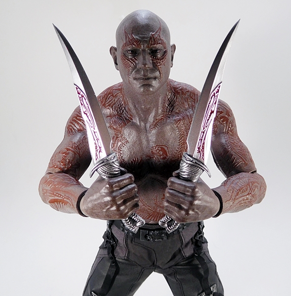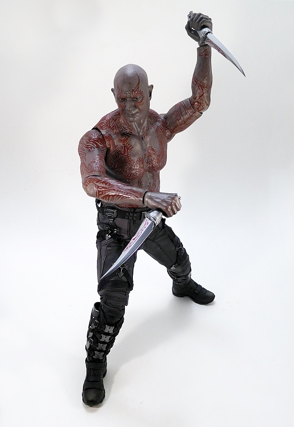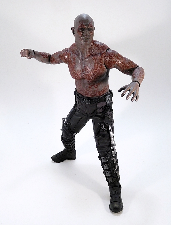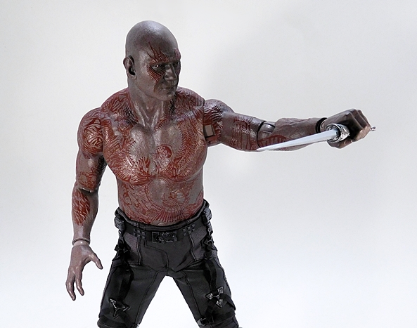On the other hand, I think they did an amazing job on his raised “tattoos” Normally, there isn’t a whole lot of opportunity for detail on a shirt-less figure, but they really did a nice job here. Coupled with this raised detail, the speckled skin looks pretty close to the body paint used by Bautista in the film. Realistic skin tones has never been a problem for Hot Toys, even when it’s an alien color. Of course, the bare arms mean exposed joints, and that’s always a downer on these figures. The rotating hinges in the elbows really make this feel more like a run-of-the-mill action figure. Hot Toys did a beautiful job with the seamless elbows on their Hulk figure, but it probably wasn’t an option here because of the sculpted tatts. On the plus side, there’s virtually no restriction on Drax’s articulation, which makes him a lot more fun to play around with than most Hot Toys.