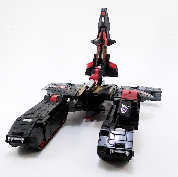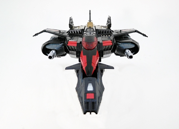 The deco here is mostly the same as the tank mode, and that’s a very good thing! It features all that lovely black plastic with red and silver trim, but here you also get some gold paint on the back rear section and a little dark gray plastic too. The striping and Decepticon emblems on the wings are actually pre-applied stickers and they look straight and sharp. They’re loads better than the ones on my Broadside figure. I only hope they don’t start peeling too badly over time.