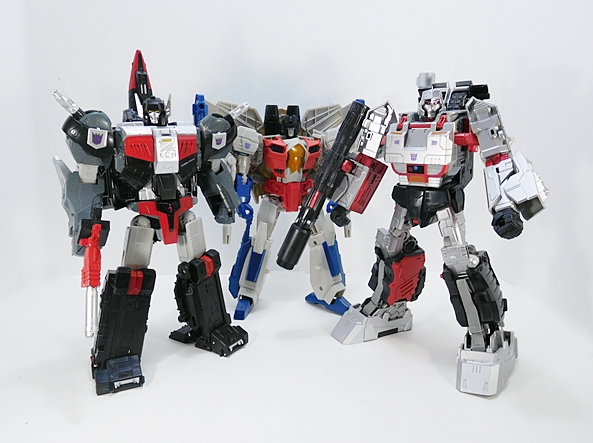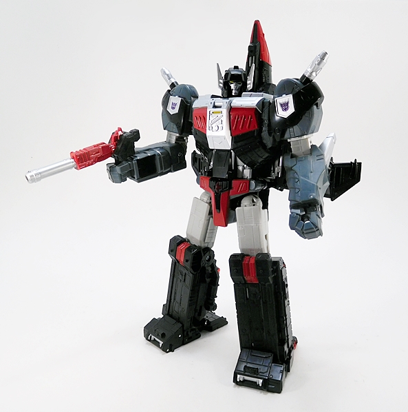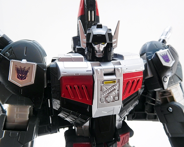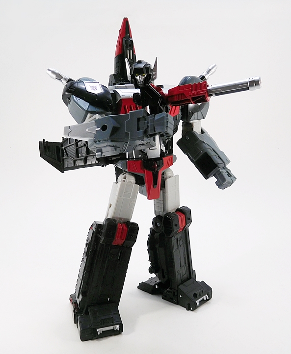 And once fused together at the waist, he is a shining pillar of Decepticon magnificence. There is nothing that I don’t like about this guy. He sports a ton of sculpted detail, carried over from his alt modes, and I’m in love with the giant cannons that angle up and outward from his shoulders. This guy can shoot Autobots out of the sky while just standing around! He’s also so satisfyingly big and bulky in all the right places. The deco carries over a lot of the black and red from his alt modes, but adds some dark and light gray plastics, as well as a lot more of that beautiful silver paint on his chest and shoulders. He’s also sporting a bold Decepticon sticker on each of those shoulders. This dude is fabulous!