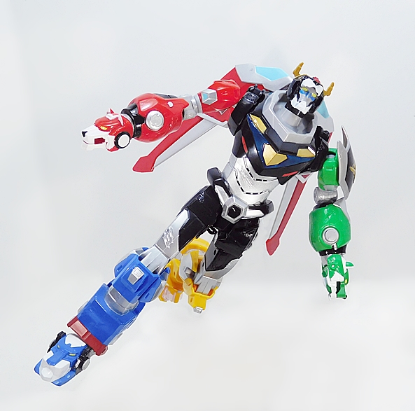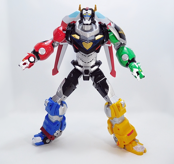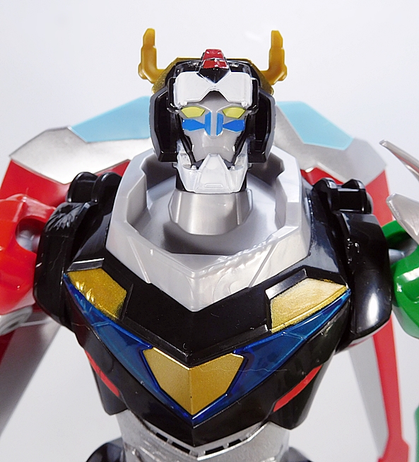 The paint and coloring are both suitably bright and glossy. I love the vibrant shades of blue, yellow, green, and red that they used for the lions, and the silver paint looks fantastic. Some of the paint lines could have been sharper, especially the gold panels on his chest, but this is where I remind myself that this is a toy and not a collectors’ item. I do, however, wish they had chosen to use some of that lovely silver paint on the parts that they left bare gray plastic. The collar around the neck and Voltron’s face itself would have looked so much better if they were painted. I think it would have really elevated the look of the whole toy.