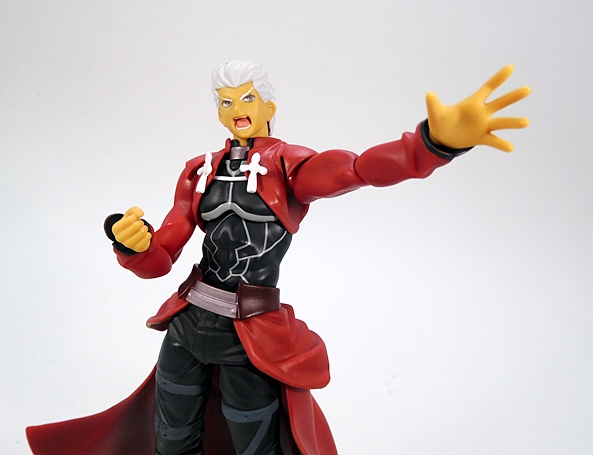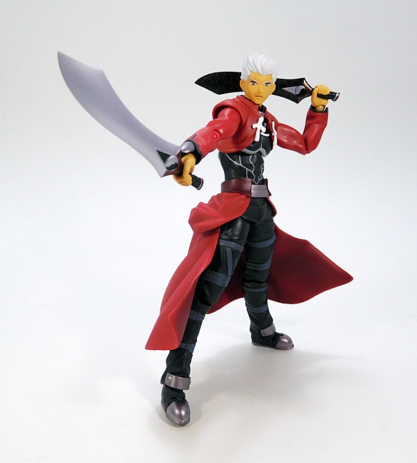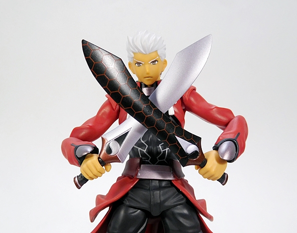 First off, Archer includes the twin swords, Kanshou and Bakuya and these are superb! They have sweeping cutlass-like blades and each one sports the Yin & Yang symbols on the hilt. Bakuya has a beautifully painted silver blade, but I especially love the honeycomb pattern on Kanshou’s dark blade. These fit snugly into the accessory holding hands and it’s nice to get some Figma swords that don’t feel ridiculously fragile… I’m looking at you SAO Figmas… ALL OF YOU! Yes, having a chunkier design makes all the difference.
