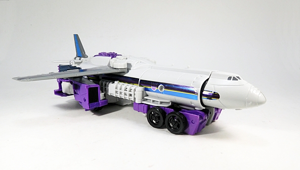 Yup, only the tips of the wings peek out the back. For a Triple Changer, I think this is a remarkably clean alt mode. The coloring is more or less the same as we saw on the robot mode, only those stickers are now more front and center on the sides of the vehicles. And just look at that one is already peeling at the corner near the back. I’m generally not a fan of Hasbro’s return to stickers for these toys and seeing this kind of peeling straight out the box isn’t about to change my mind.