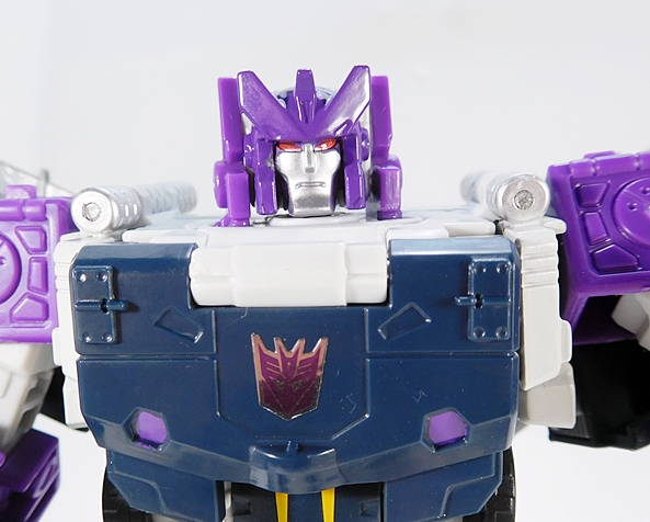 The head sculpt is terrific. It’s very Sunbow cartoon accurate. I really dig the angling crests on the top of his “helmet” as well as the silver paint for the face and red for the eyes. Like most of these Titans Return Voyager figures, he has that gimmick where you press a button on the chest and two pylons pop up on the sides of his head. I still don’t really get these and I prefer to leave them down. Naturally, Octane’s head detaches and transforms into the tiny Titan Master, Murk. Murk is cast in the same pale gray and purple plastic as his larger robot mate, and he has a pretty interesting little head sculpt.