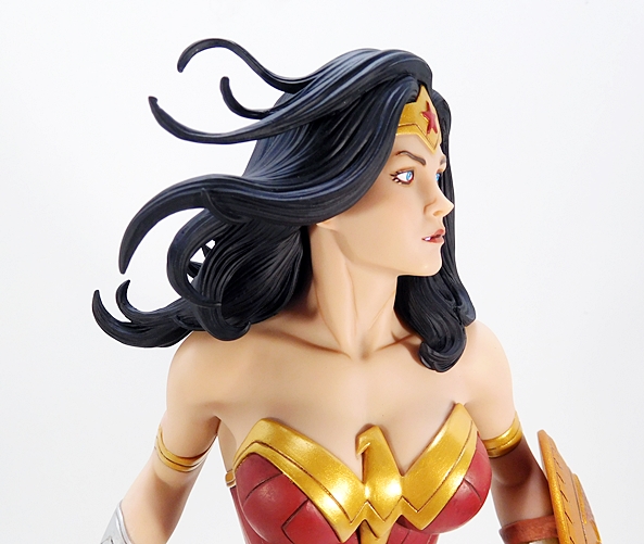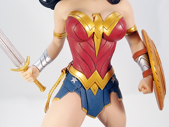 And then there’s the costume, which exhibits some magnificent sculpting and paintwork. The gold eagle and WW Belt look as if they are actually layered over the red corset, despite all being sculpted from one piece. The corset and bracers include sharp cut lines and the skirt is textured to look like leather with sculpted stars and border edges. The boots include sculpted creases where her ankle flexes as well as shin and knee armor with nicks and scrapes from battle. The deep crimson, lustrous gold leaf, and deep blue paints are masterfully applied with virtually no slop or missteps to be seen. And all of the colors contrast beautifully with her warm, soft skin tones.