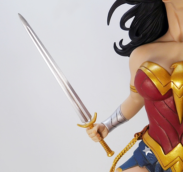 Diana’s gear includes her sword, shield, and golden lasso.  The bottom part of the hilt is sculpted as part of her hand, while the blade and crossguard are one separate piece that pegs in through the top of the hand and holds together quite securely. The golden hilt features a sculpted, ribbed grip and a simple pommel and crossguard. The double-edged blade has a deep fuller running through the center and tapers rather quickly to a sharp point.
