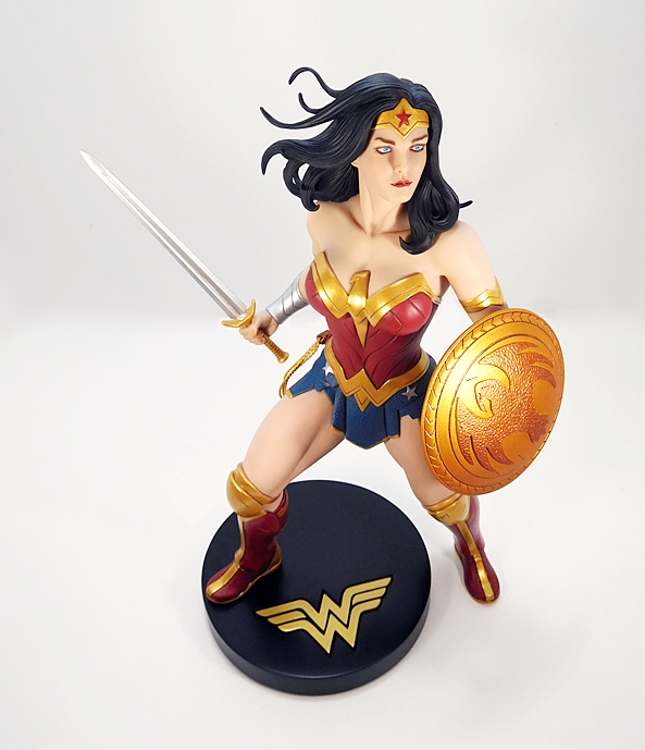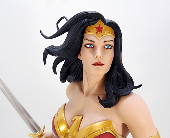 After having the Adam Hughes Wonder Woman for only a few weeks, I never thought my head could be turned by another statue treatment of the character so quickly. That’s not to knock the Hughes Wonder Woman, because it’s a fantastic piece. Indeed, the two of these statues compliment each other perfectly. The Hughes statue has a smoother and less complex costume, emphasizing the more classic blue starfield panties, whereas this one features Diana as the grittier warrior princess. Despite being in the same Designer Series line, this statue was a smidgen pricier than the Hughes statue, but only by about ten bucks. Either way, she was well worth it.