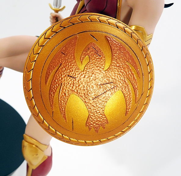 The shield is a striking piece of work on its own right. The face in adorned with a bird sculpted to look like hammered bronze, and a segmented border that looks like it might be meant to simulate a rope pattern. There are some stray scrapes in the surface to show the shield has seen some action. The reverse of the shield featured sculpted straps sculpted and painted to look like calfskin and are detailed down to the faux rivets that hold them into place. It’s also painted in bronze finish, which distinguishes it nicely from the gold paint on her costume. I’ve always loved her depicted as an actual warrior and while she’s strong and skilled enough to best most foes with her bare hands, she just looks so much more bad ass with her sword and shield in hand.