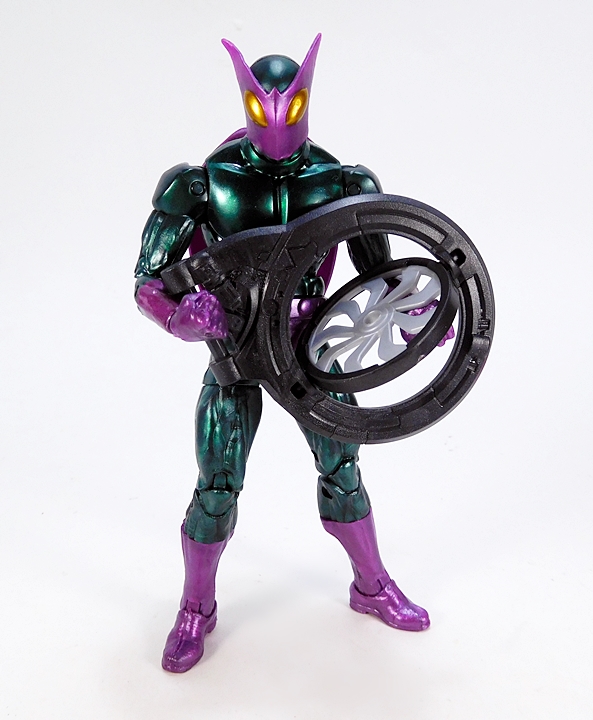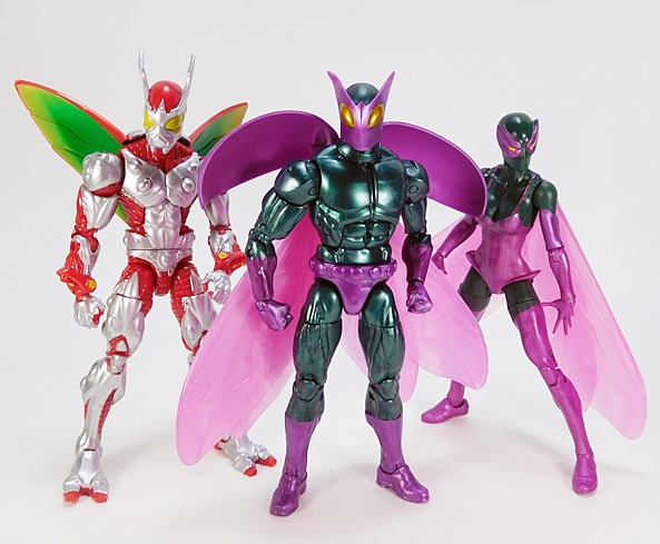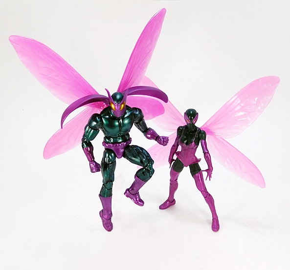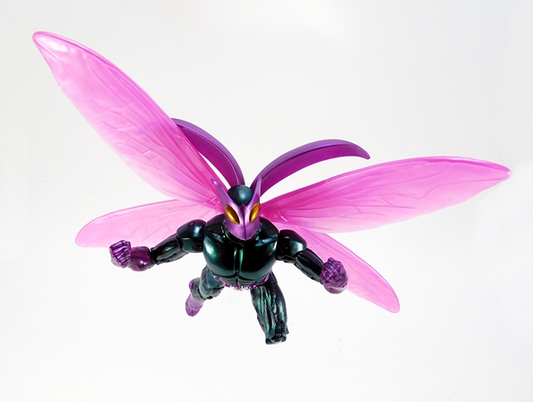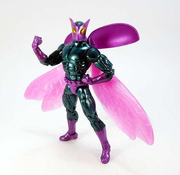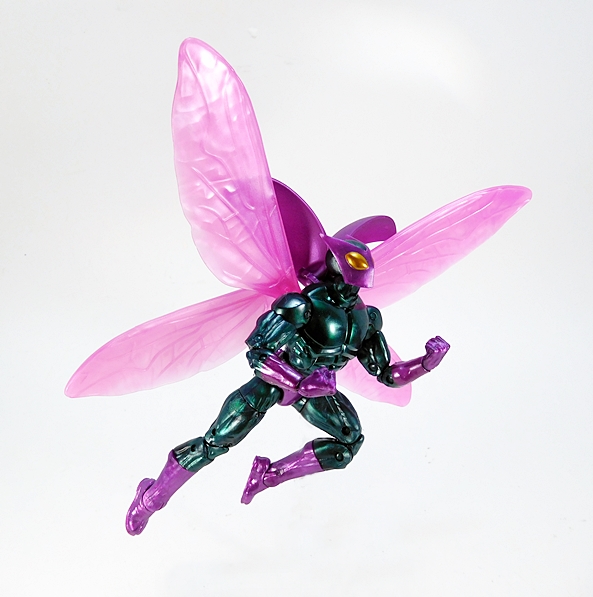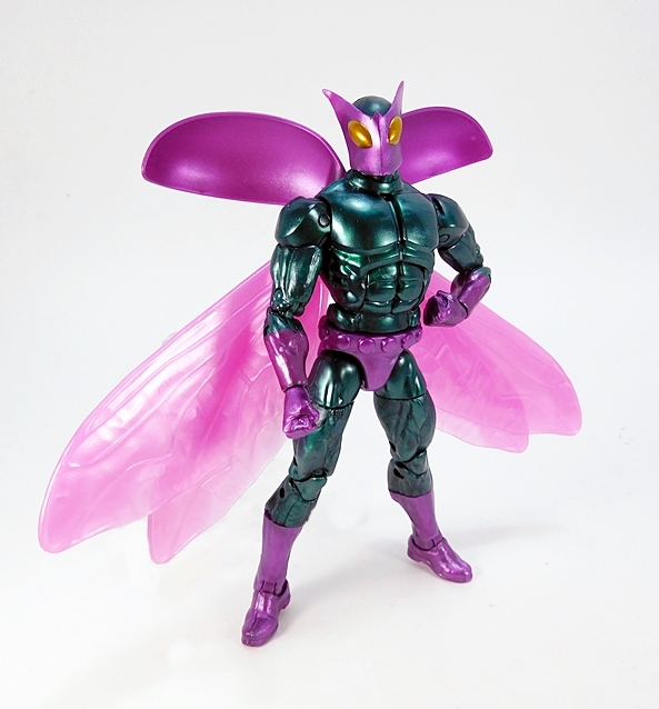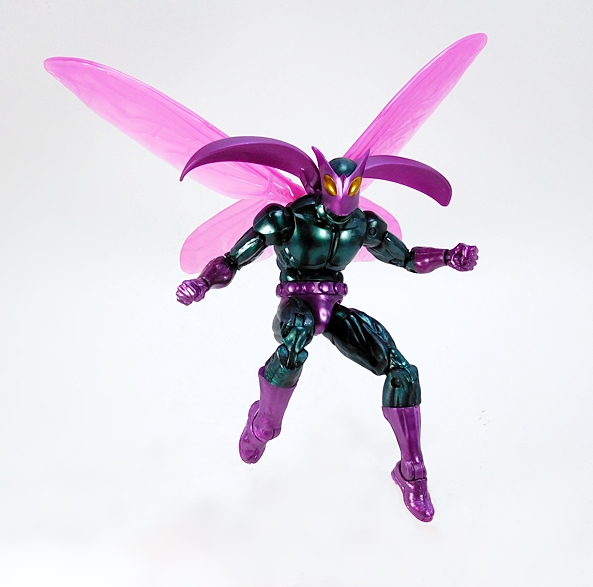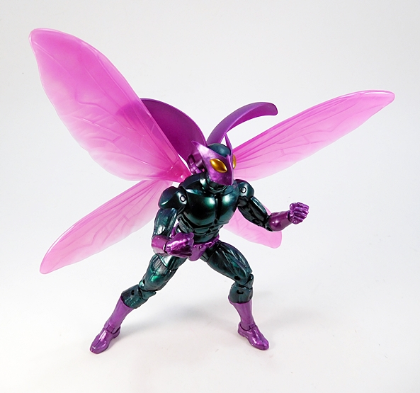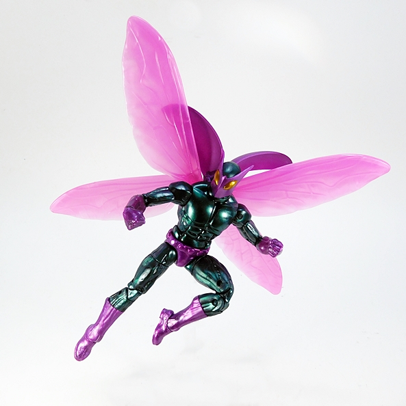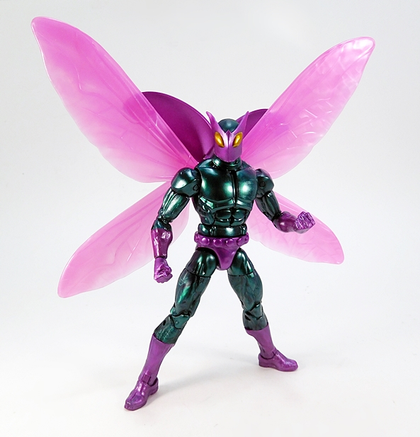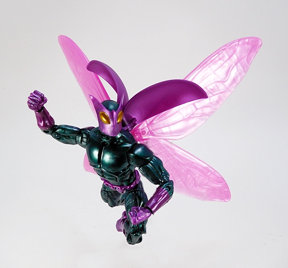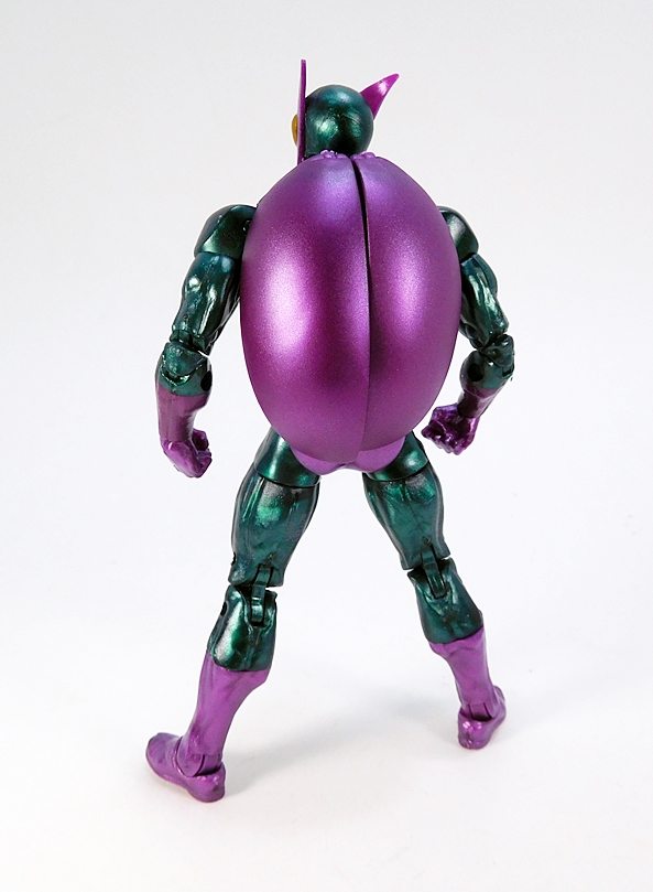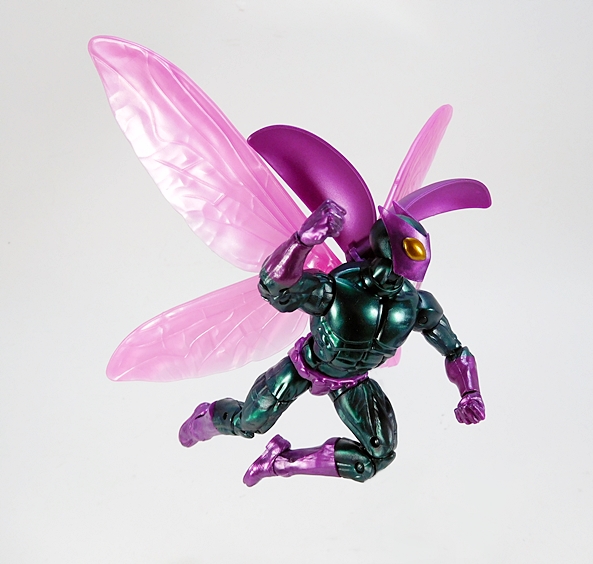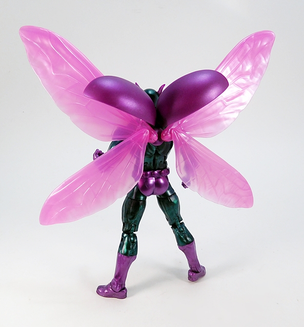 Do the wings look familiar? They’re the same translucent purple flappers that we got with the Janice Lincoln Beetle. The main wings are mounted on rotating hinges and the smaller ones are pegged into the larger ones so they will swivel. All four have sculpted veins running throughout them and they really look great with the purple and green deco of the suit.