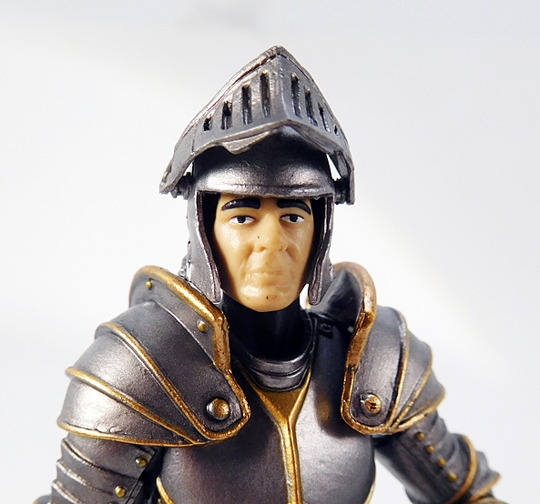 Each of the heads come on their own bar-bell ball joint and these noggins are a bit of a mixed bag. OK, none of them are terrible, but overall I’m more partial to the head sculpts we got with Series 1. That stock head, for example, sure got an extra helping of eyebrows! Who is this, Sir Eugene Levy? The second head is my favorite. I think it’s the best overall sculpt and the beard makes him look distinguished. The final head is OK, but looks a little lumpy. Keep in mind, as with most 4-inch figures, they don’t hold up all that well to close scrutiny via the camera lens. Truth be told, they all look fine to me when viewed with my naked peepers. Well, except for that first head… his eyebrows are still huge! Are three heads not enough to customize your Knights? Well, let’s talk helmets…