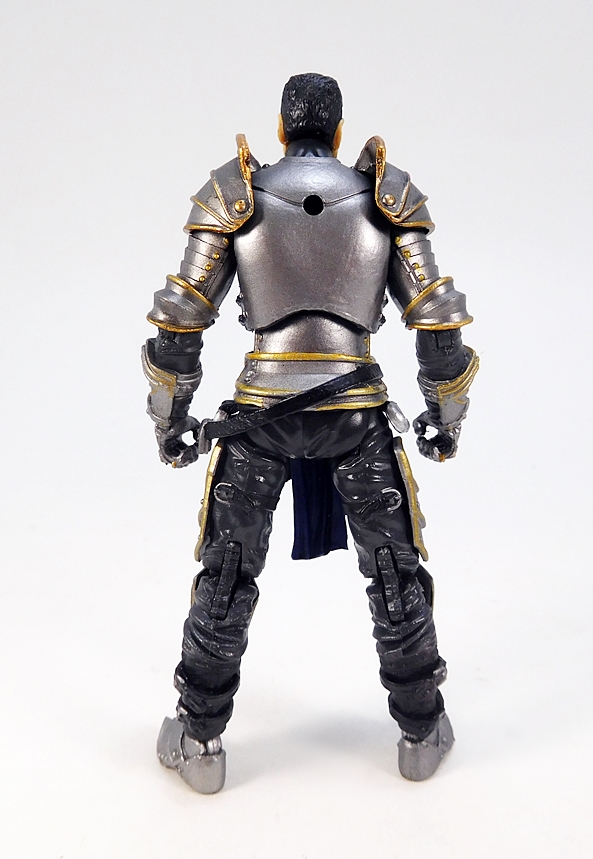 Next up, he comes with a broadsword and scabbard. The scabbard can peg into the hole on the strap coming off the left side of his belt. It’s a bit of work to get it in there, but unlike the visors, I was able to make this work. There is also a ring on each side of his breastplate, which can hold the scabbard. Functional holsters for guns usually impress me in 4-inch figures, so as you can imagine, I’m practically losing my mind over a functional sword scabbard. Not that we didn’t see them in Series 1 also. The scabbard is painted black with some blue straps and a gold throat and tip.