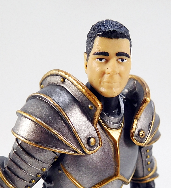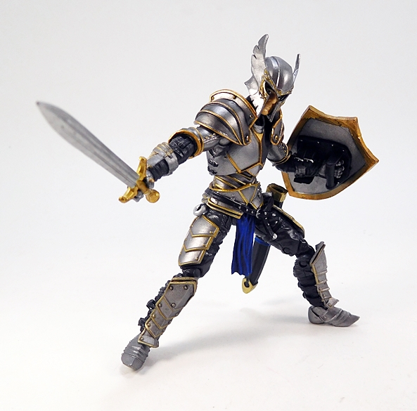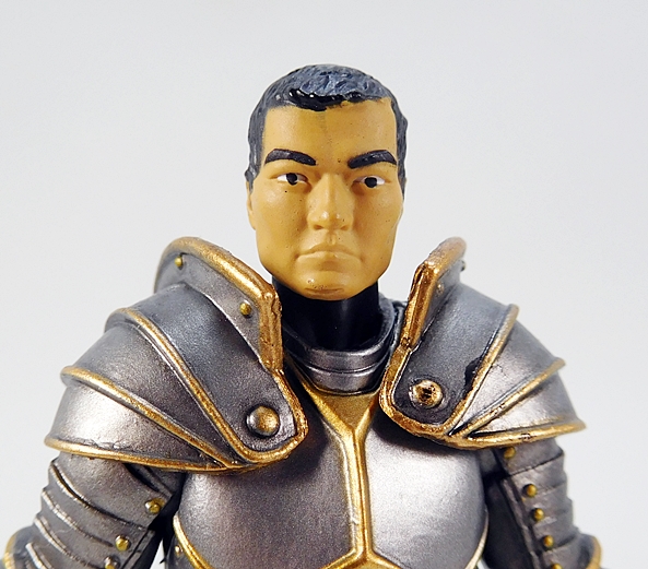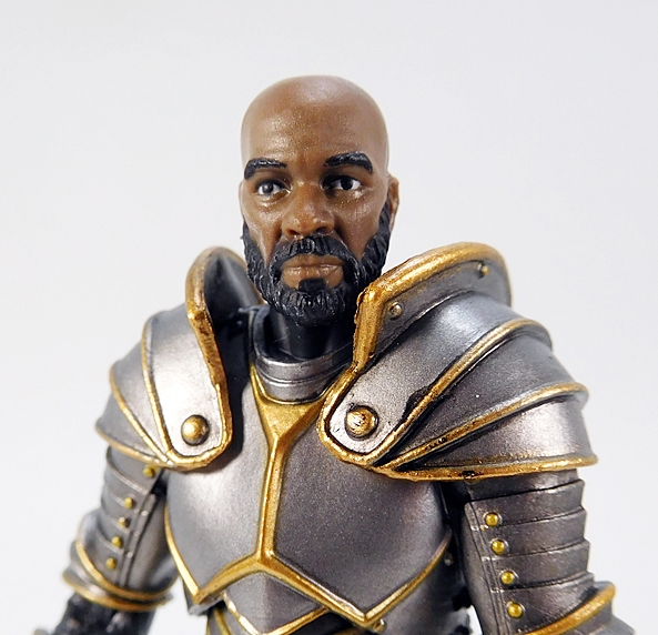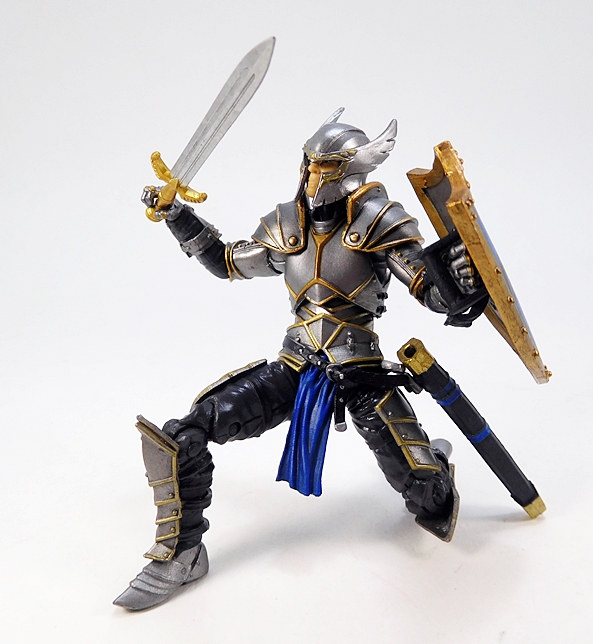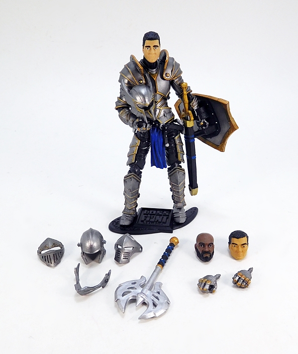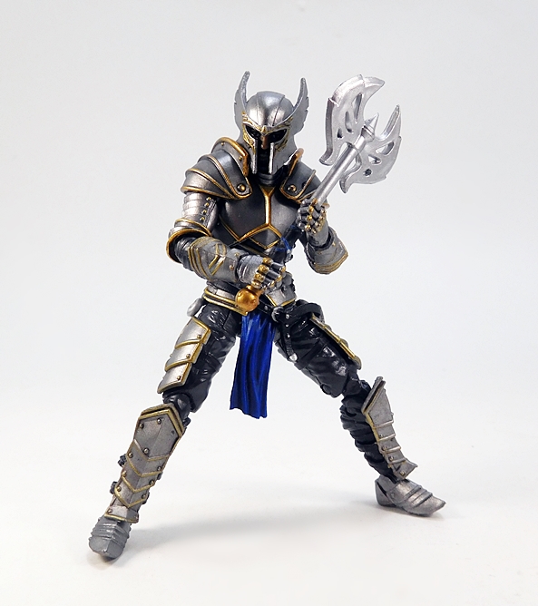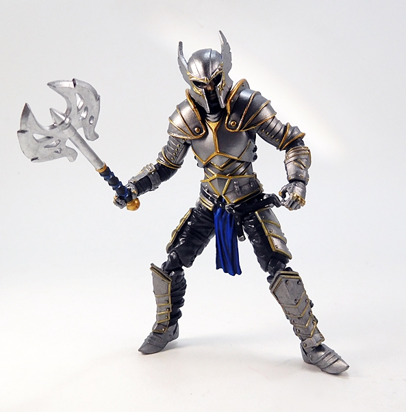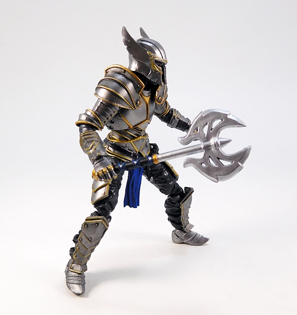 As for weapons, you get a couple of choices here as well. For starters, The Knight comes with this pretty cool double-headed battleaxe. It’s a very ornate weapon and includes a highly stylized head with cut-outs in the blades. The grip is sculpted and painted with black, gold, and blue. It’s designed to be wielded with one or both hands, and the articulation does allow for either.