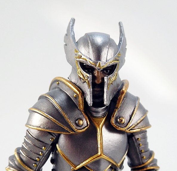 First off, you get this stand-alone helmet, which looks great and fits the heads perfectly. I really have to give BFS credit in that both Series 1 and Series 2 have had some of the most impressive helmets I’ve ever seen in this scale. I love the sweeping curves of the horned crest and the extra sculpted detail around the visor, which is also painted gold to match the paint accents of the armor. The helmet fits so well that the eyes actually line up with the visor holes. So cool!