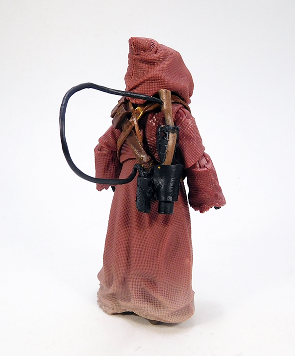 The Jawa comes with two weapons, I believe both are considered ion blasters: One is a blunderbuss design and the other is attached to a battery pack. I’ve always loved these weapons and Hasbro did a particularly nice job recreating them here. The one with the battery pack resembles a chibi Lee-Enfield Rifle right down to the little integral magazine and wood stock. It’s permanently attached to the battery pack with a cord and fits into the holster on the back of the belt. Unfortunately, the Jawa’s hands are not really sculpted to work well with either of these weapons. There’s no trigger finger to get through the trigger guard of the battery powered blaster and he can barely even hold them across his chest because the robes limit his arm movement.