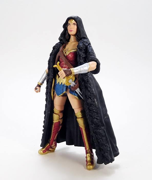 While I don’t own the Multiverse Batman V Superman Wonder Woman, this one looks like this is a re-sculpt of that previous release. She’s been fitted with a soft plastic sleeveless coat, and her arms have been sculpted with sleeves on them to resemble part of the jacket. It looks good, I like the sculpted fur fringe, although it does cover up a lot of the beautiful work they did on her rather iconic outfit underneath. And damn, it is a beautiful outfit, with plenty of detail, and some snappy red, blue and gold paint. I’ll actually save some of that gushing for when I review the TRU Exclusive version.
