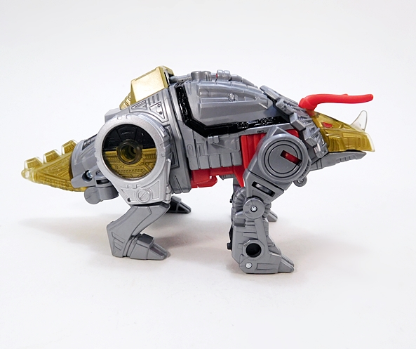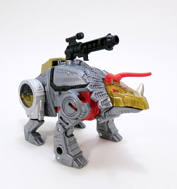 The deco is also pretty spot on to what I would want in a modern Slag. Much of Slug’s coloring is derived from his rich gray plastic, but you also get some black and gold paint, as well as the previously mentioned yellow-tinted clear plastic. A little red can be glimpsed from his undercarriage and his horns are red as well. There are even a couple stickers near the base of his tail. The only thing I would have added would be some silver paint to his collar, but I guess you have to leave something for Takara to do in order to tempt the importers.