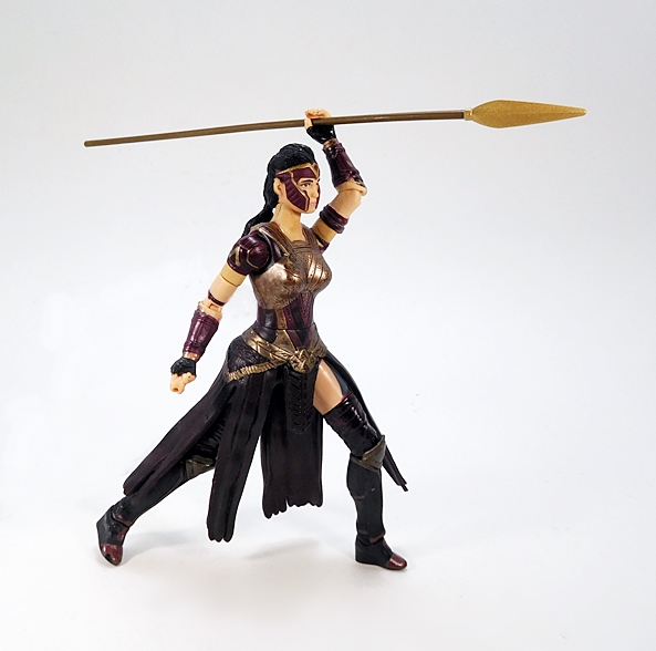 Menalippe comes with three accessories: A bow, an arrow, and a spear. The bow is brown with a gold grip and additional gold fixtures. There’s no string, and it doesn’t look like one could be easily attached, so you just have to use your imagination. The arrow is also brown and gold. Mattel designed the figure to have a socket in the right hand to plug the arrow into. The downside, it renders that hand useless for anything else, but it does mean you can actually get her to hold the arrow well and even pose as if she’s knocked it and is ready to shoot. A swap-out hand would have been nice, especially since it’s a common thing to see in Hasbro’s 6-inch Marvel line, but let’s face it, DC Multiverse isn’t working at that level yet.
