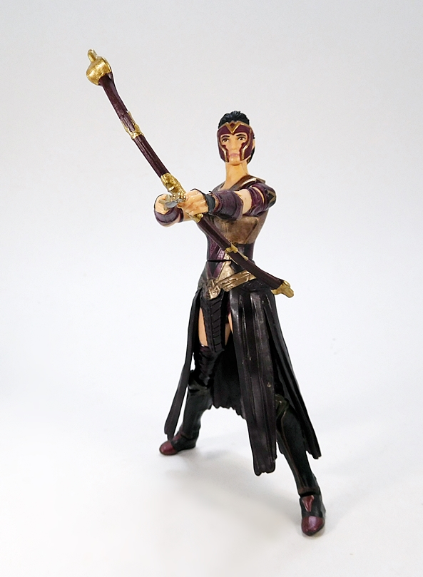 The bronze belt looks like it’s supposed to be an eagle motif, with the wings reaching out and back around her hips. Below the belt Menalippe has a soft plastic brown skirt, which is sculpted to resemble strips of leather. Under that she has sculpted high boots with grieves and knee armor. My only real gripe here is that the color of her flesh tones doesn’t match too well between her upper biceps and lower arms. The upper biceps are painted, but the bottom arms are bare plastic.