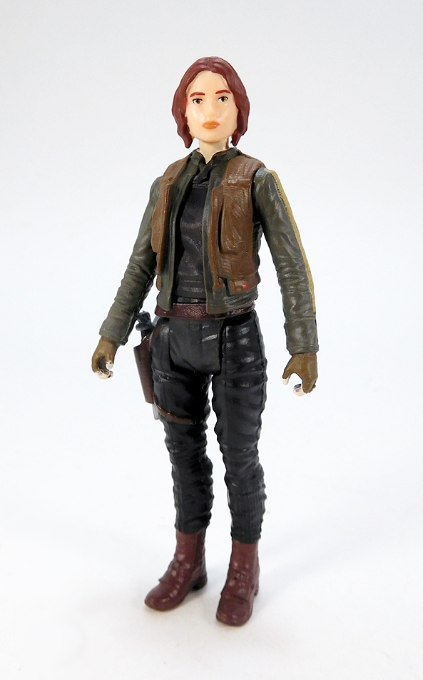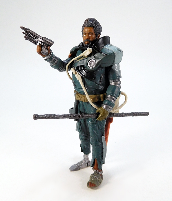 Saw comes with two accessories, his walking staff and his pistol. The staff is actually useful, because Saw can be a bit difficult to keep standing without it. The pistol features a cool and unique design, fits into a holster on his right hip, and he can hold it in his right hand. The staff can be held in either hand. Next up… Sergeant Jyn Erso!