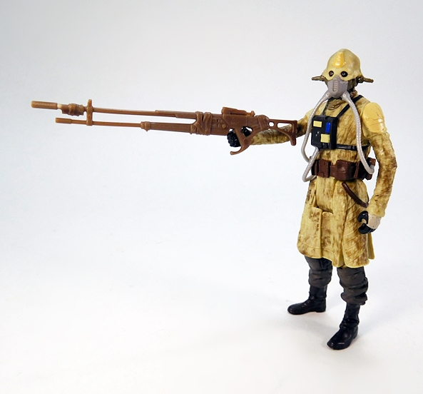 Mr. Two-Tubes comes with his rather unique looking rifle. which is very long, very thin, and rather fragile. I gut a stress mark on mine just from having him hold it near the muzzle. And because it’s so long, and Edrio is just a 5-POA figure, he tends to look better holding it like a walking stick, than he does holding it like he’s about to fire it. On to our final stop… The Hovertank Pilot!
