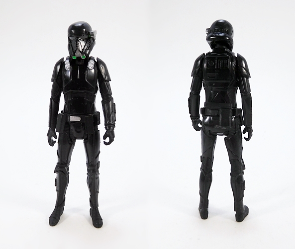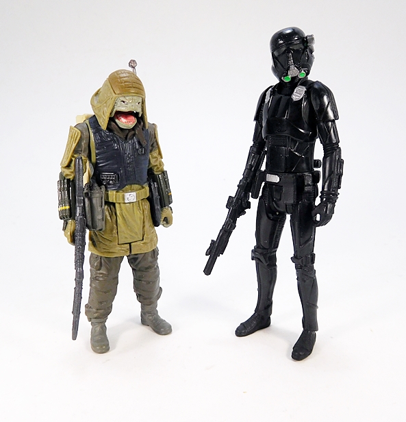 With all the time I spent gushing about Pao, it’s probably for the better that I don’t have a lot to say about the Death Trooper. Oh, he’s not a bad figure at all, but how much is there really to say about him? He reminds me of the First Order TIE Pilot that I looked at ages ago. A solid figure, a fine sculpt, but he’s mostly sculpted black plastic and not a lot else. In this case the Death Trooper features some silver paint hits on his belt buckle, his shoulders, and what I assume is a range finder. He also has those two eerie lights on his helmet painted green, and they pop very nicely against all that black plastic.