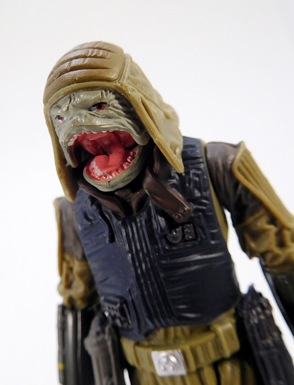 Pao is my Boba Fett of the Rogue One film, and by that I mean he did very little, but it was love at first sight when I first saw him screaming with that huge mouth in one of the promo clips. Not only is he one of the stand-out aliens of the film, He was also one of the brave Rebels who volunteered to go on the suicide mission to Scarif and try to get the plans to the Death Star. No doubt he deserved a figure, and he got a pretty damn great one. The detail on this fellow is absolutely superb. He’s got all kinds of cool gear sculpted onto him, including equipment on his belt, what look like rockets on his wrist bracers, and there’s plenty of wonderful little flourishes sculpted into his fatigues and his vest. You also get some nice little paint touches on the figure, including the silver belt buckle and the yellow striping on his arm missiles.