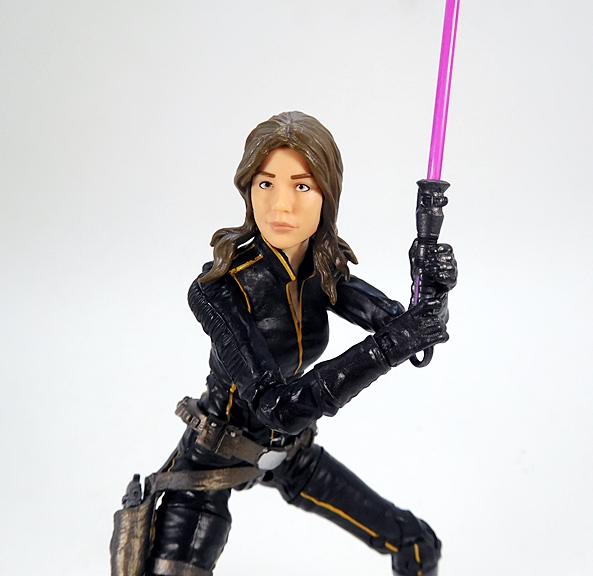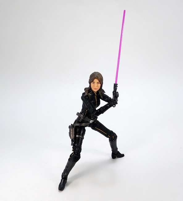 Her lightsaber hilt is quite unique and comes with a detachable purple blade. It even has a little purple paint on the side of the hilt, making it all the more distinctive. She can hold it either hand or wield it two-handed if you prefer.