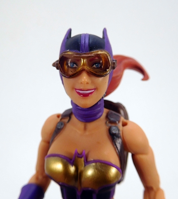 The coloring on the figure is also fabulous. I love the purple they used, and it’s accompanied by some bright yellow for the boots and belt pouches, plus you get some snappy gold paint on her chest and the belt buckle. Even the lacings on the boots are neatly painted and if you look really closely you can see tiny bat symbols on the sides in a slightly darker shade of yellow. There are some inconsistent spots on her pants, which could have been smoothed out, but I can just chalk that up to some weathering from action in the field and still be happy with it. Finally, I really like the plastic they’re using for the skin on these figures. It’s warm and even and looks great.