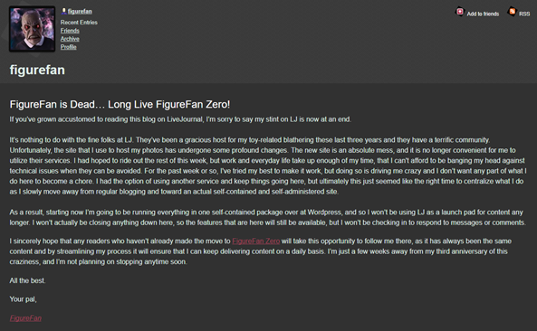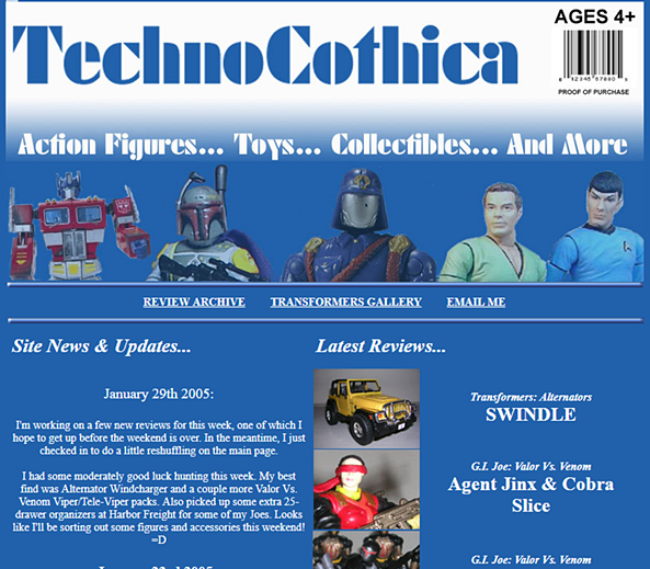Four years later and my newfound love of toys was beginning to overtake my love of video games. I had started a great new job (And I’m still there!) and my premature midlife crisis was behind me. But I was still collecting toys! At the time I was also running a floundering video game site on Geocities called TechnoCothica that nobody ever visited. I decided to shut it down and reinvent it as a toy review site. Only two things remained the same: The name and the fact that nobody ever visited it. Not a lot of it still exists, but I managed to dig up some of its remains. Eventually, I migrated to LiveJournal, where I adopted the name FigureFan. It was a moniker that I registered under at some toy forum somewhere just so I could post a reply and help someone identify an action figure accessory. If I knew it was going to stick, I probably would have picked something better.