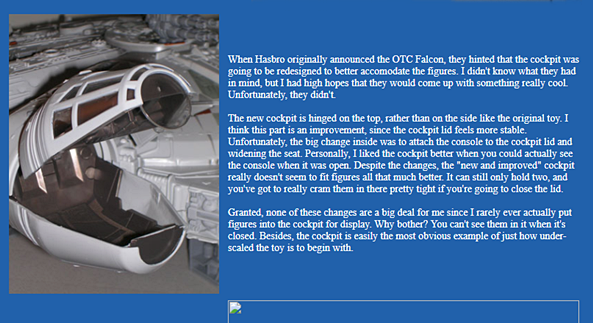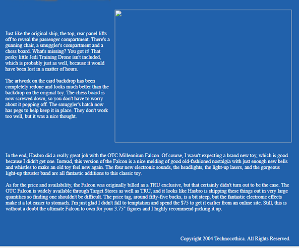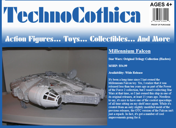 Before I wrap up, I wanted to reprint one of the old reviews from TechnoCothica. I’ve been going through my old archive and as rough as a lot of it is, I’ve been getting some inspiration from it. I decided to go with my review of Hasbro’s Original Trilogy Millennium Falcon, mainly because I never got around to reviewing it here on FFZ. Some of the picture files don’t exist any more, which is probably for the best because back then I was shooting on a piece of plastic shelving in the corner of my bedroom with with flash lighting. Nonetheless, I’ve reconstructed what I could just for shits and giggles. I hope to eventually set up a page devoted to what I can recover from the old site.