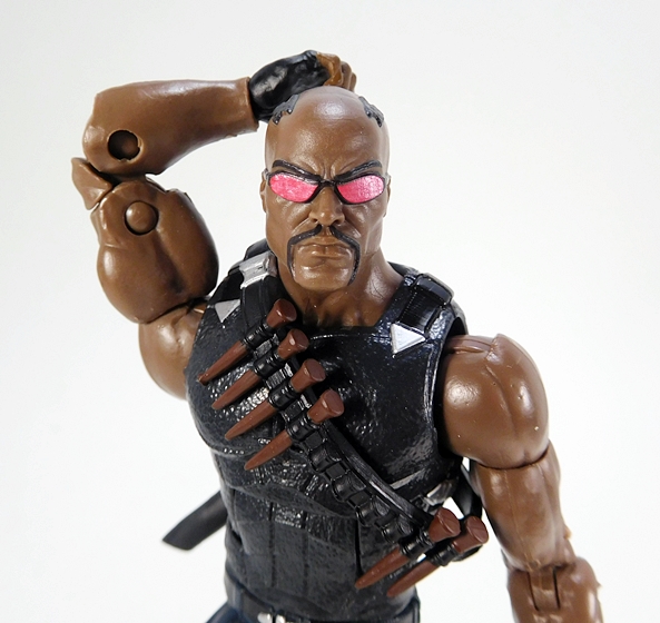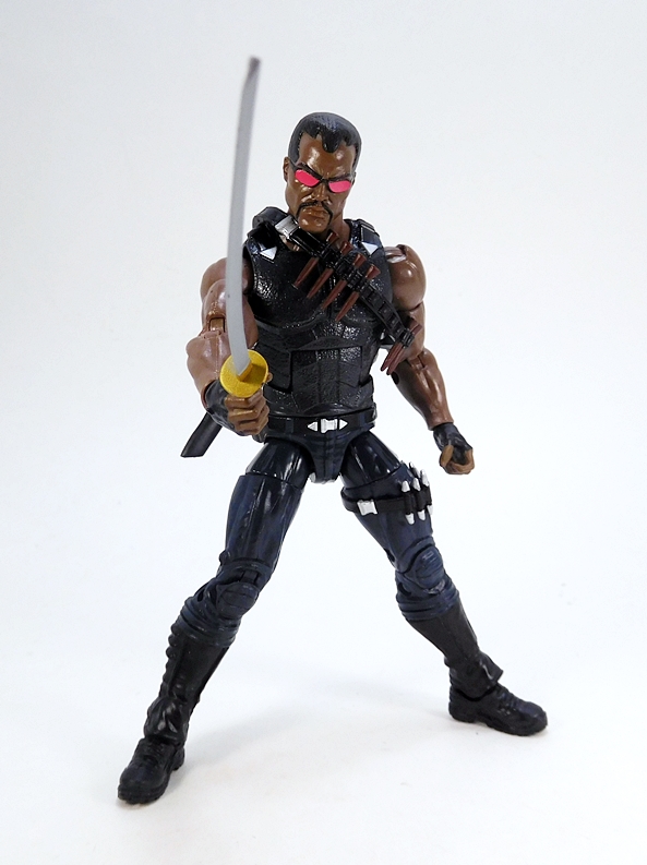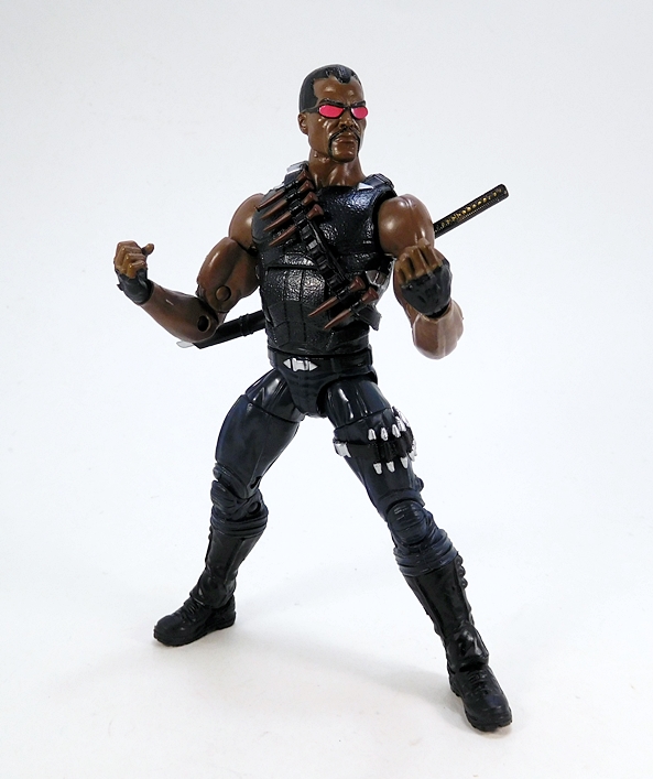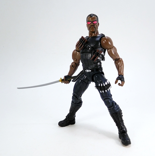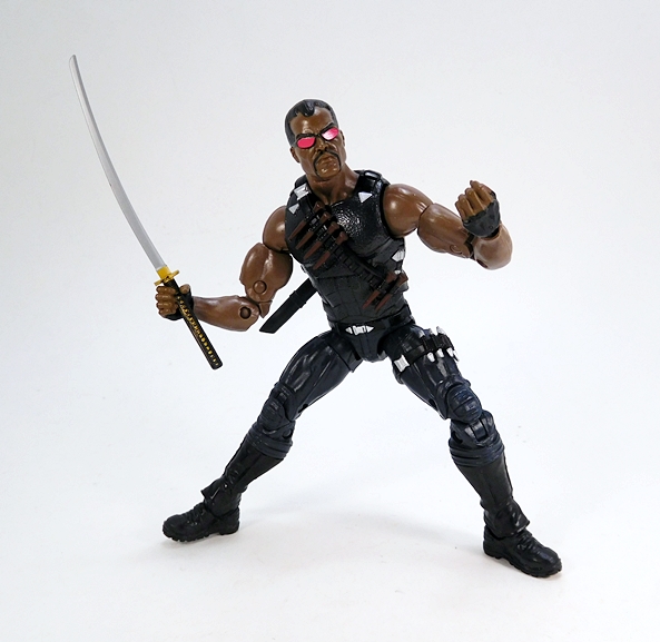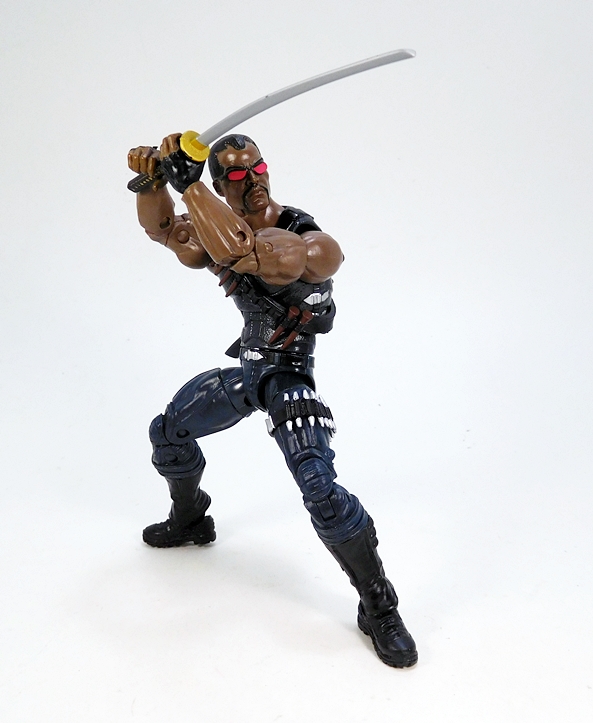 As for articulation, Blade has all the points he needs to get all rough and tumble with the nightstalkers of the Marvel Universe. The arms feature rotating hinges in the shoulders and wrists, double hinges in the elbows, and swivels in the biceps. The torso has a rotating waist, an ab crunch hinge just under the chest, and both a ball joint and hinge in the neck. The legs are ball jointed at the hips, have swivels in the thighs, double hinges in the knees, and the ankles have both hinges and rockers. The joints feel great on this guy, and he’s loads of fun to play with and pose.