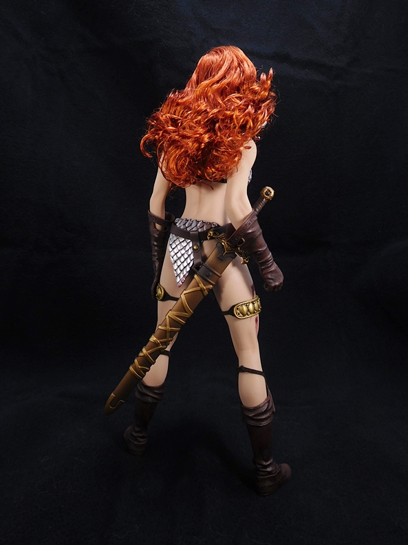As mentioned, Sonja comes out of the box in need of having her head attached. You also have to gird on her her sword belt, but apart from that she’s all set to go. Not that there would be a lot to put on her otherwise. Her outfit is appropriately nearly non-existant, with just a scale mail bikini top held up by some rather ornate shoulders, and a couple of patches of scale mail to protect her coming and going down there in her nether regions. The scale armor bits are sculpted plastic and they look great with bright and lustrous metallic silver paint. These pieces are secured with brown leather straps, and they stay put quite well while posing her. She also has a pair of bronze guards on her thighs and some great looking brown boots and gauntlets. Both feature some nice sculpted rumpling to make them look like leather, and the gauntlets have some etched scrollwork as decorations. While the boots look great, they do not allow for much range of motion in the ankles, so her feet won’t always be flush with the ground in those wide stances, but I found that she balances really well. As for the gloves, swapping out her hands means swapping out the whole glove, and oh boy is that a pain in the ass. I’ve since settled with giving her a weapon gripping hand on the right and a relaxed hand on the left, but there are more to choose from if you’re feeling particularly patient. I’ll also note that Sonja also comes with a bronze band for her left upper arm. You can have a look at it on the package shot, but I’ve opted to forgo that piece in favor of a more minimalist presentation.