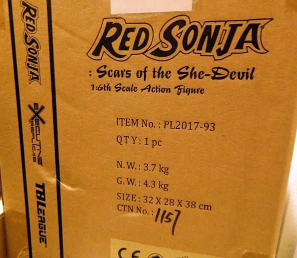 This is Phicen’s second release of Red Sonja, dubbed “Scars of the She-Devil.” The first sold out very quickly. This time around, they fixed some complaints about the head sculpt and hair color, gave her a battle damaged look by adding some scarring, decked her out with new accessories and changed up her armor. In short, this isn’t a re-release to add more figures into circulation, but rather an entirely new version. And because this is the Deluxe Edition, they bundled her with a diorama style display base. The figure comes in this massive mailer box with the figure’s regular box inside and a giant brick of styrofoam to hold the base.