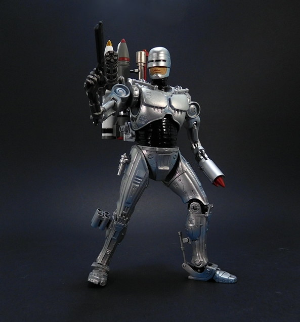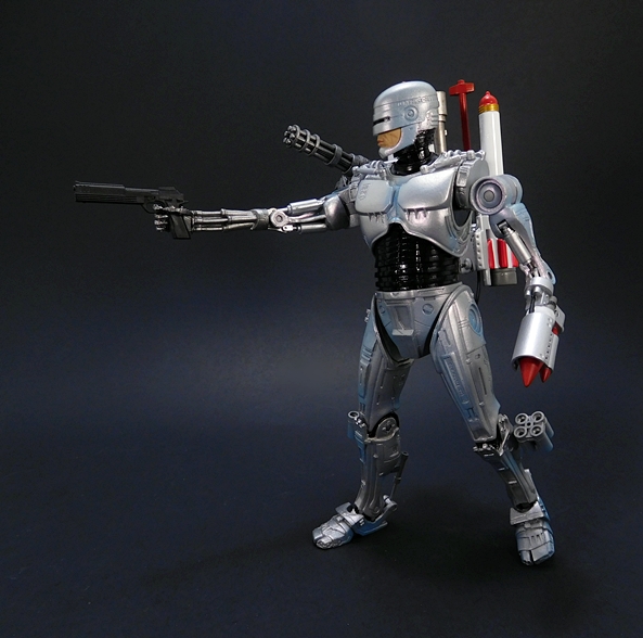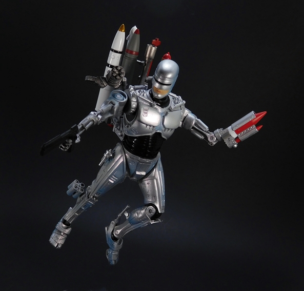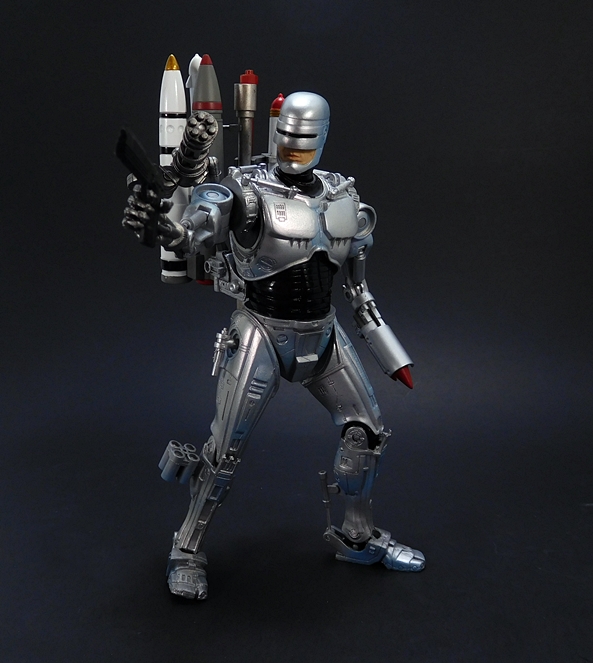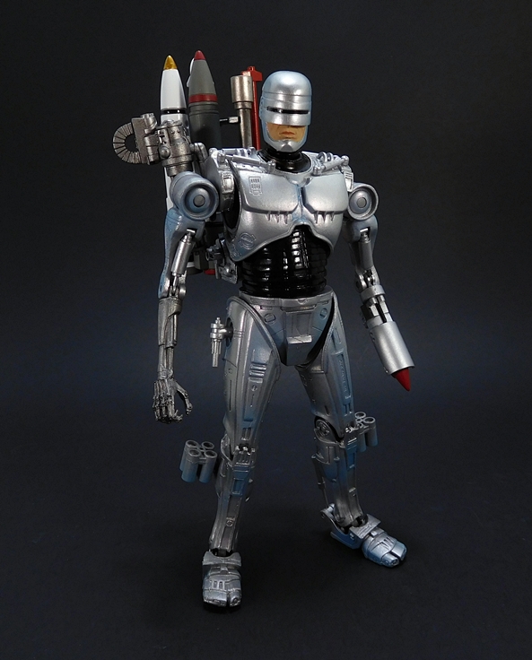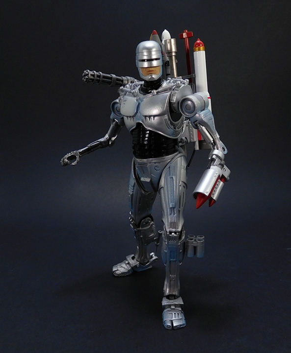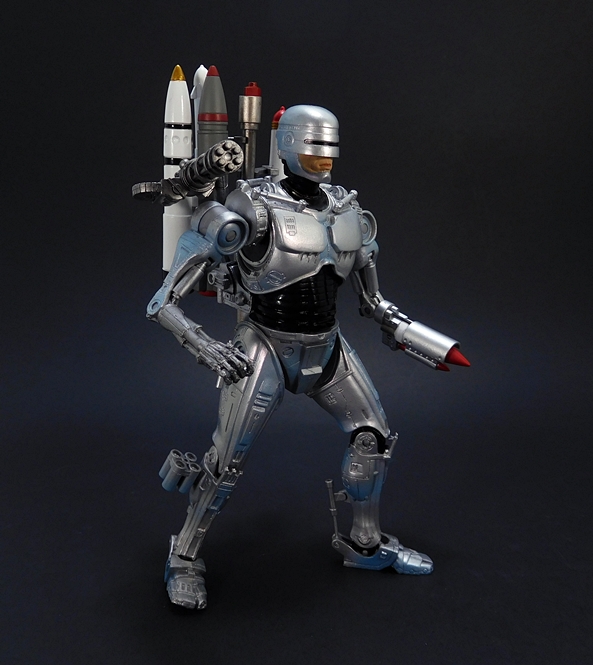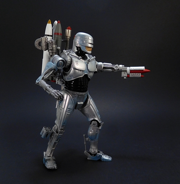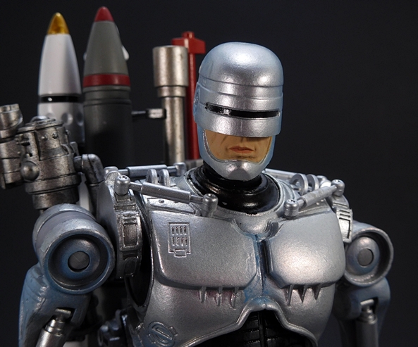 The right arm is the same, but his lower left arm has been replaced with what looks like a rocket launcher. The sculpt still features all the great little touches like the OCP branding on the leg and helmet, the working pistons on his lower legs and the backs of his upper arms, the thruster modules attached to the outsides of his lower legs, and the detail in the right hand is extremely intricate.