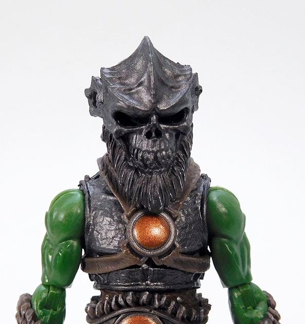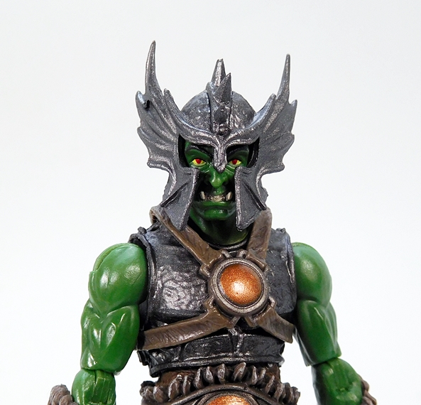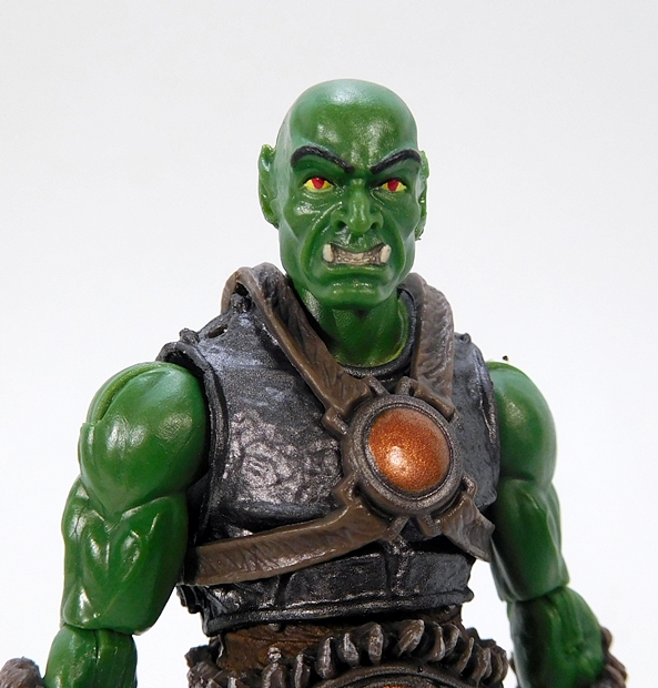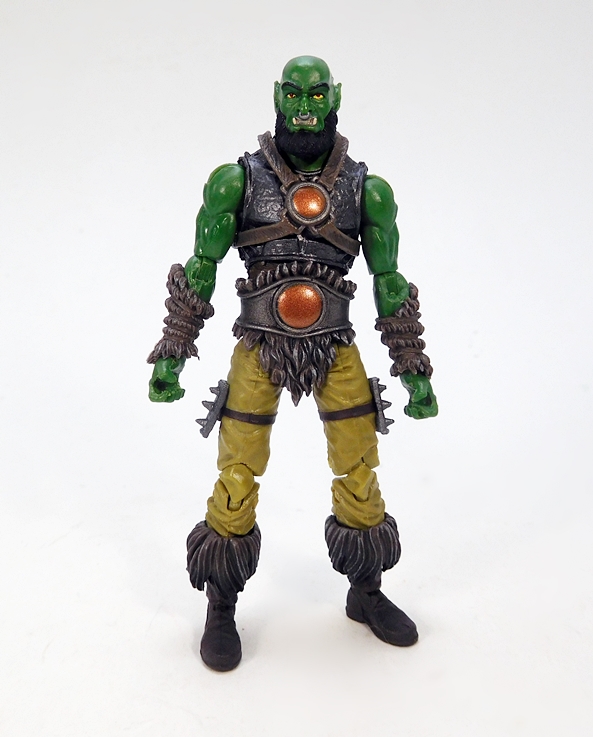 Additional separate pieces provide his wide belt with sculpted fur and the large medallion belt buckle, the wrist wraps, and the furry fringe at the tops of his boots. There are also two spiked plates that tab into the slots on the sides of his legs. The chest harness is also a separate piece. All the detail here is quite exquisite for a figure in this scale, right down to the tiny sculpted buckles meant to hold on his thigh straps. And while the colors on the outfit tend to be drab, the green skin adds some flash to the overall deco and the steel paint for the armor looks quite nice.