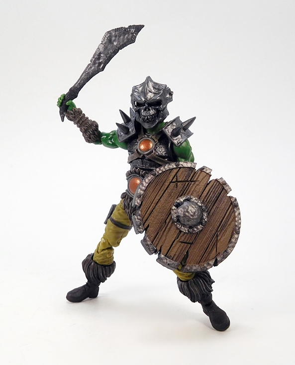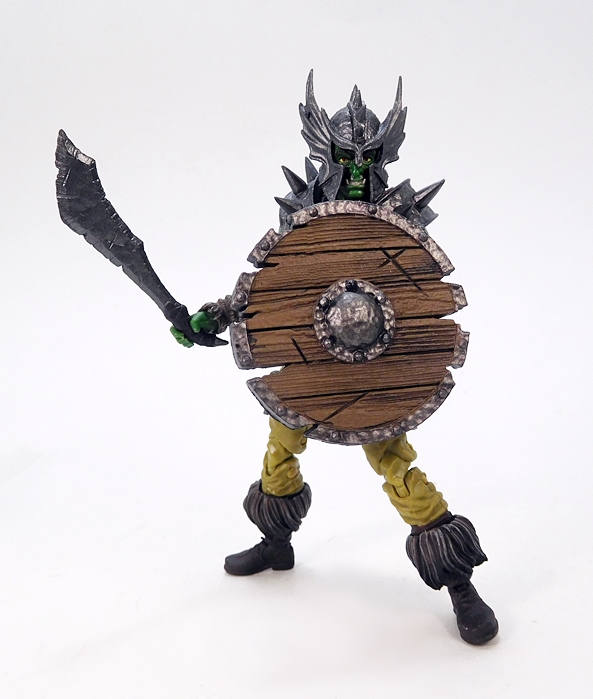 The Orc comes with a sword and shield, and each of these are wonderfully crude weapons certainly befitting of a savage Orc. The sword looks like someone took a farming implement, gave it a couple of wacks with a blacksmithing hammer to shape it into a something a little more befitting of butchering manflesh and handed it out to the next Orc in line. It’s jagged and primitive edges give it the no no nonsense look of a cleaver for the rank-and-file soldier and that’s pretty much perfect for this guy. The blade’s finish has a nice metal sheen to it and the grip features a sculpted wrap that looks like it’s meant to be animal hide.