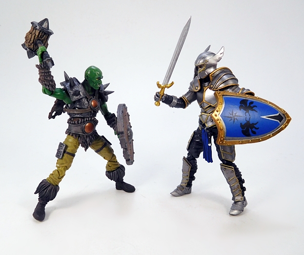 The other piece of headgear is a full helmet with some rather sinister looking wings and cheek-plates. This piece is sculpted with the same hammered finish seen on the chest armor, and a mohawk of nasty and crude looking spikes. I like the design of this helmet a lot, but I also think it would fit more on an evil knight than it does on an Orc. If I do wind up troop building some of these guys, I’ll definitely reserve this helmet for the leader. And speaking of troop building, between all these different helmets and the two heads, you could probably buy a half-dozen of these Orcs and have no two look alike, and we haven’t even come to the weapons yet. So let’s talk weapons!