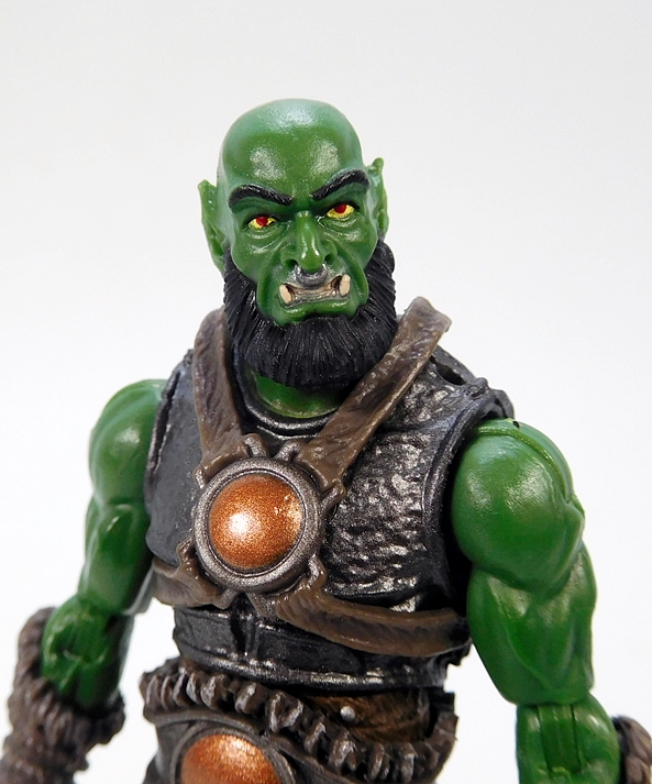 You get two head sculpts to choose from, which is very welcome, because rather than representing a single character, this figure is meant to be customized in different ways to build your Orc army. The stock head features a full beard, as well as great little details like the nose ring and the protruding lower teeth. The alternate head is clean shaven and without the nose ring. Both feature some very sharp details, particularly in the pointed ears. The paint is overall pretty sharp and clean, although my bearded had has a slightly wonky eye. It’s nothing too bad, but if you happen to be picking up this figure at a convention, you might want to check out the eyes before buying.