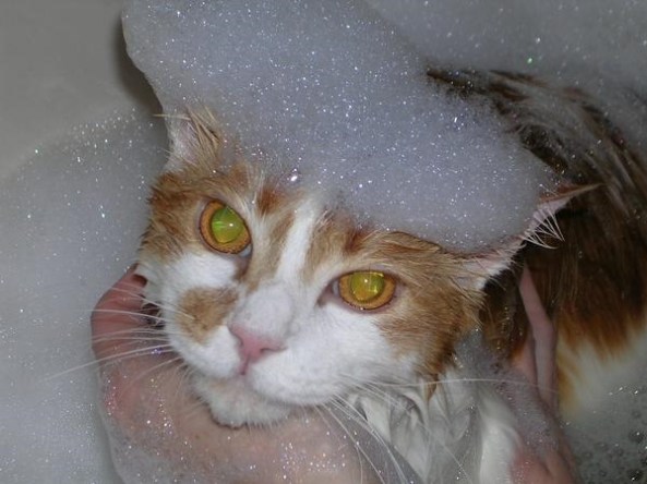 “HELP!!! CALL THE ASPCA… HUMAN IS GIVING ME A BATH BECAUSE I SLEPT IN DIRT!!!!”