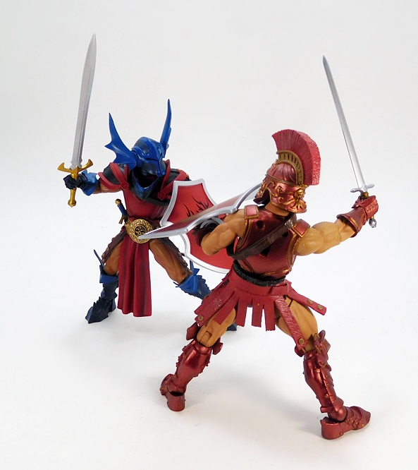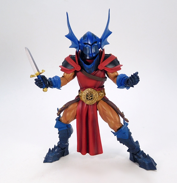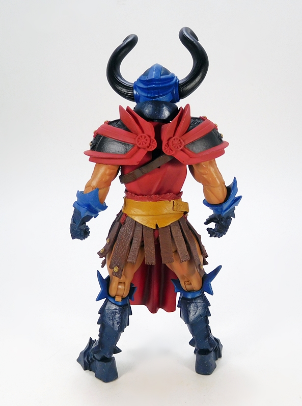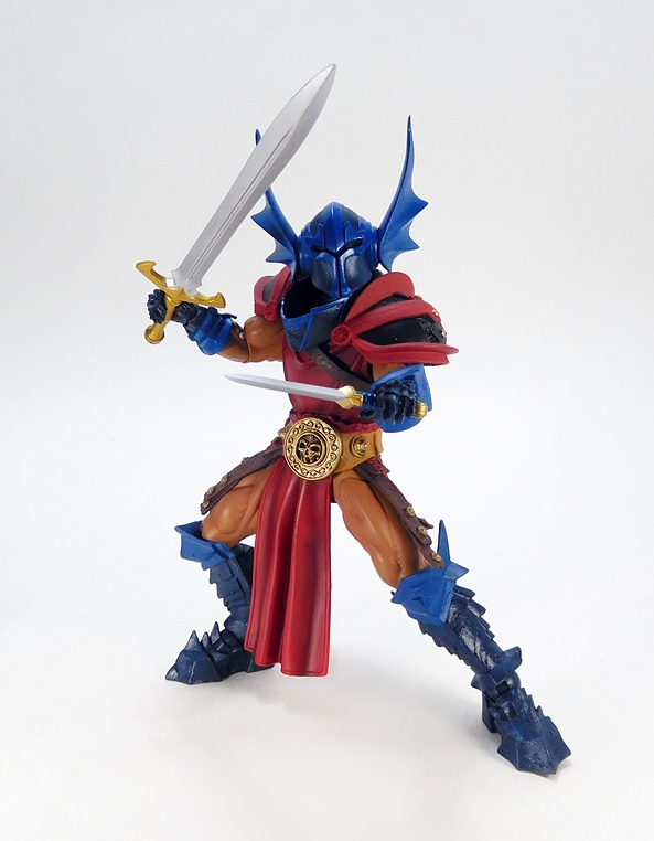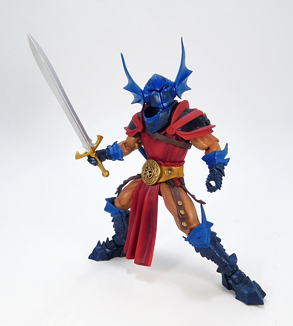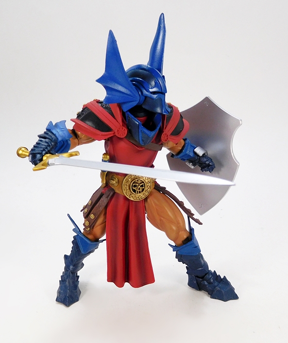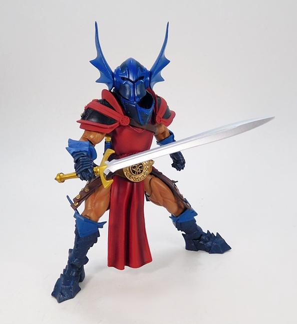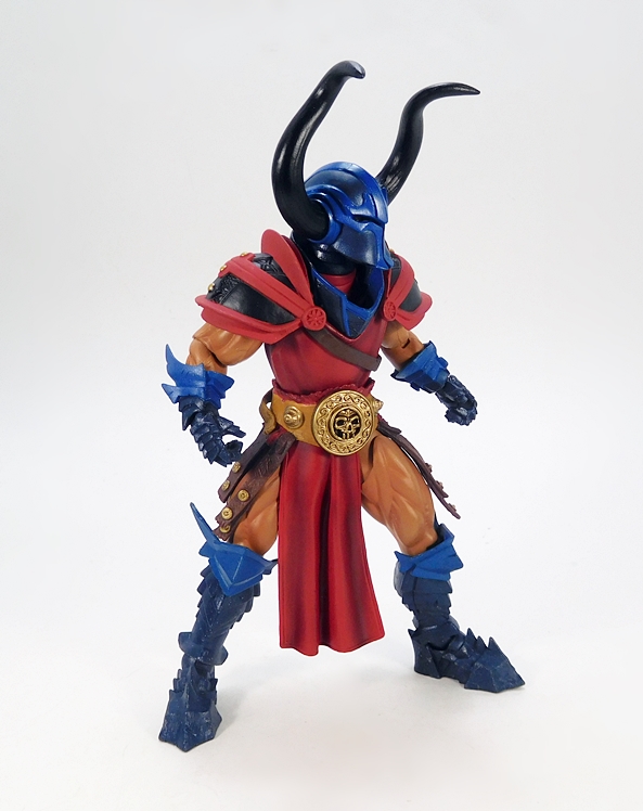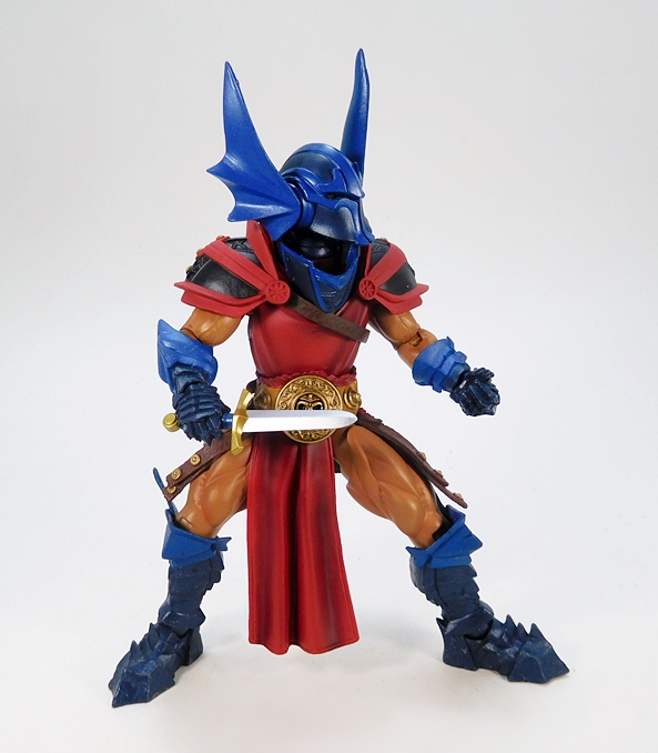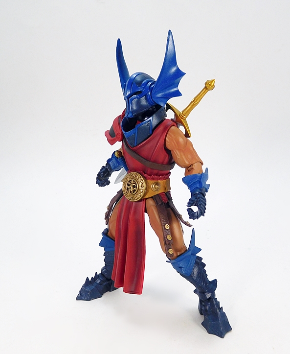 Naturally, everything has also received a fresh coat of paint, and I really dig the color combinations here. The tabard is crimson and matches the trim on his shoulders. The boots, gloves, neck guard, and helmet are all a striking deep metallic blue with some lighter blue to give it a little more variety. The belt is a mix of tan and brown with some lovely gold paint on the giant belt buckle and on the fixtures. Finally, the skin is cast in a tanned flesh color. The paint T4H uses on this line has always had a premium look to it, and that trend continues here.