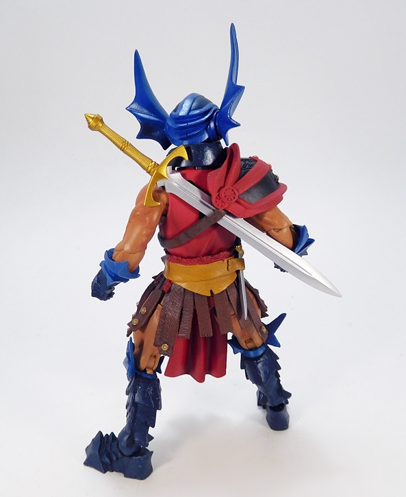 Raygorr does show up a little light on the accessories, but what he does have is plenty good. For starters, he comes with not one, but two of the ubiquitous Mythic Legions brown sword belts. One comes on the figure, worn as a shoulder strap and I’ve opted not to use the other, because I don’t want to cover up that beautiful belt he has. His sword is the same sculpt that I first saw bundled with Gorgo Aetherblade. It’s a classical fantasy design with gold hilt and grip and a stout silver blade. If you opt to give him the brown waist-belt, he can carry it there. You can also remove one of his shoulders and have him wear it across his back. It looks pretty good slung back there, but I prefer he keep both his shoulders.